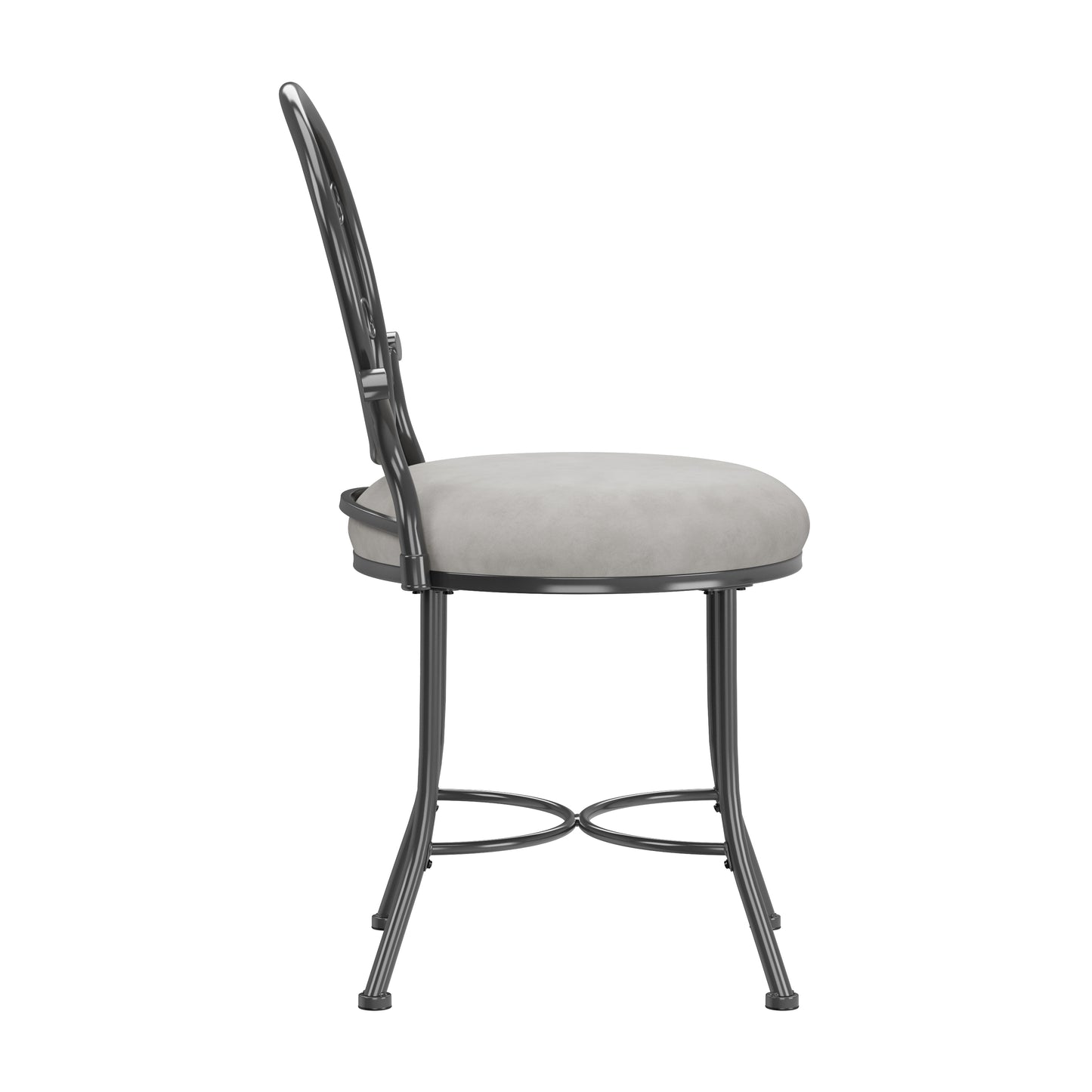 This gray metal vanity stool features a tall back with Celtic knot work, framed in a strong steel circular chairback and complimented by arched stretchers and flared legs for a true traditional look. A padded seat in light gray 100% upholstery keeps you supported, while the metallic gray finish keeps it cool. The vanity stool is perfect for the bathroom, bedroom, make-up room, office or wherever extra seating is needed. Assembly required.