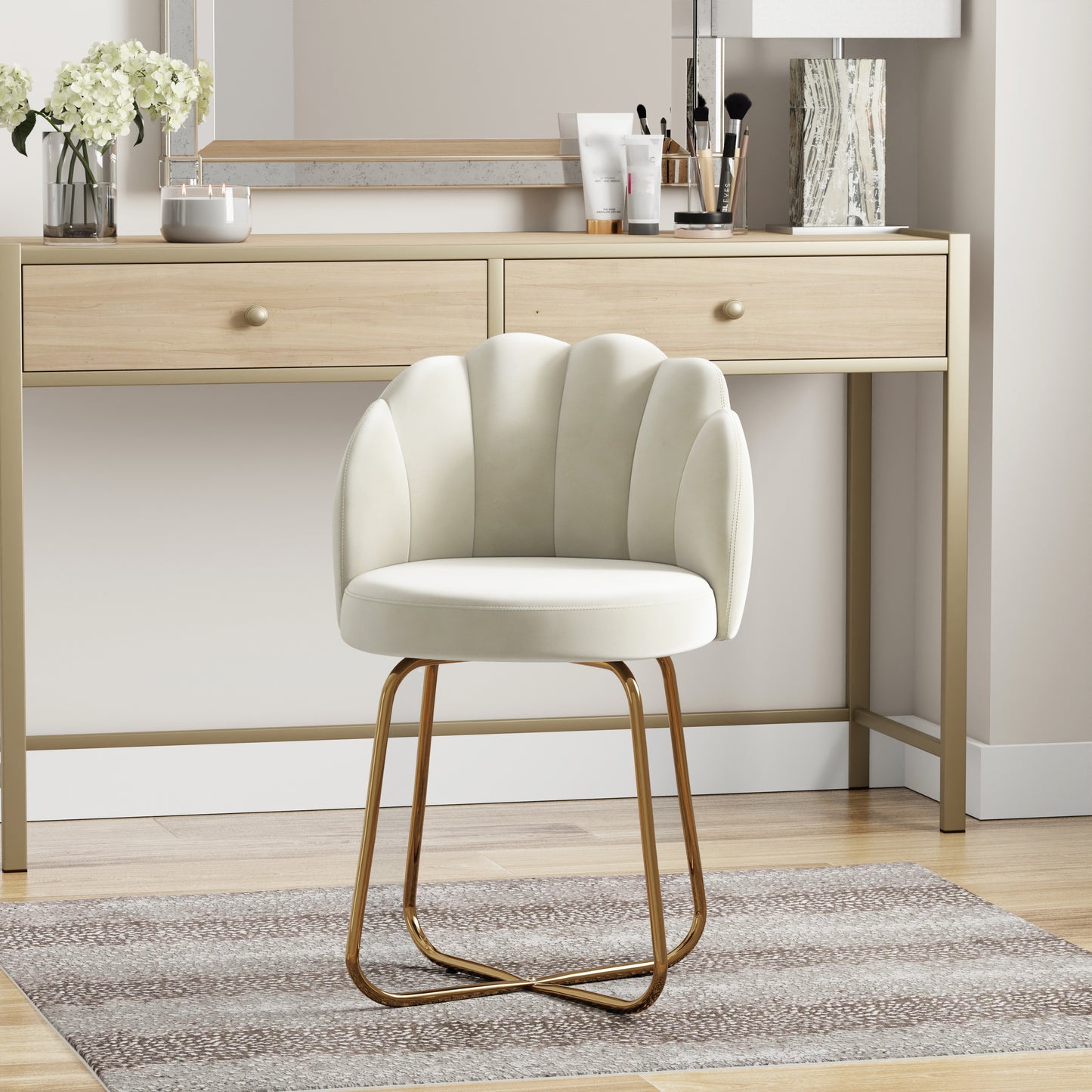 A showstopper in any room, the plush scallop back vanity stool is adorned with rich, on-trend off white fabric upholstery over thick, comfort-conscious padding that invites you to linger just a while longer in its velvety luxury. Criss-crossed chrome legs kick up the sophistication while keeping the silhouette slim and sleek. Tubular steel construction means this vanity chair is as strong as it is striking. Add a touch of class to your bedroom or bathroom vanity, living room, or entryway. Easy to assemble.