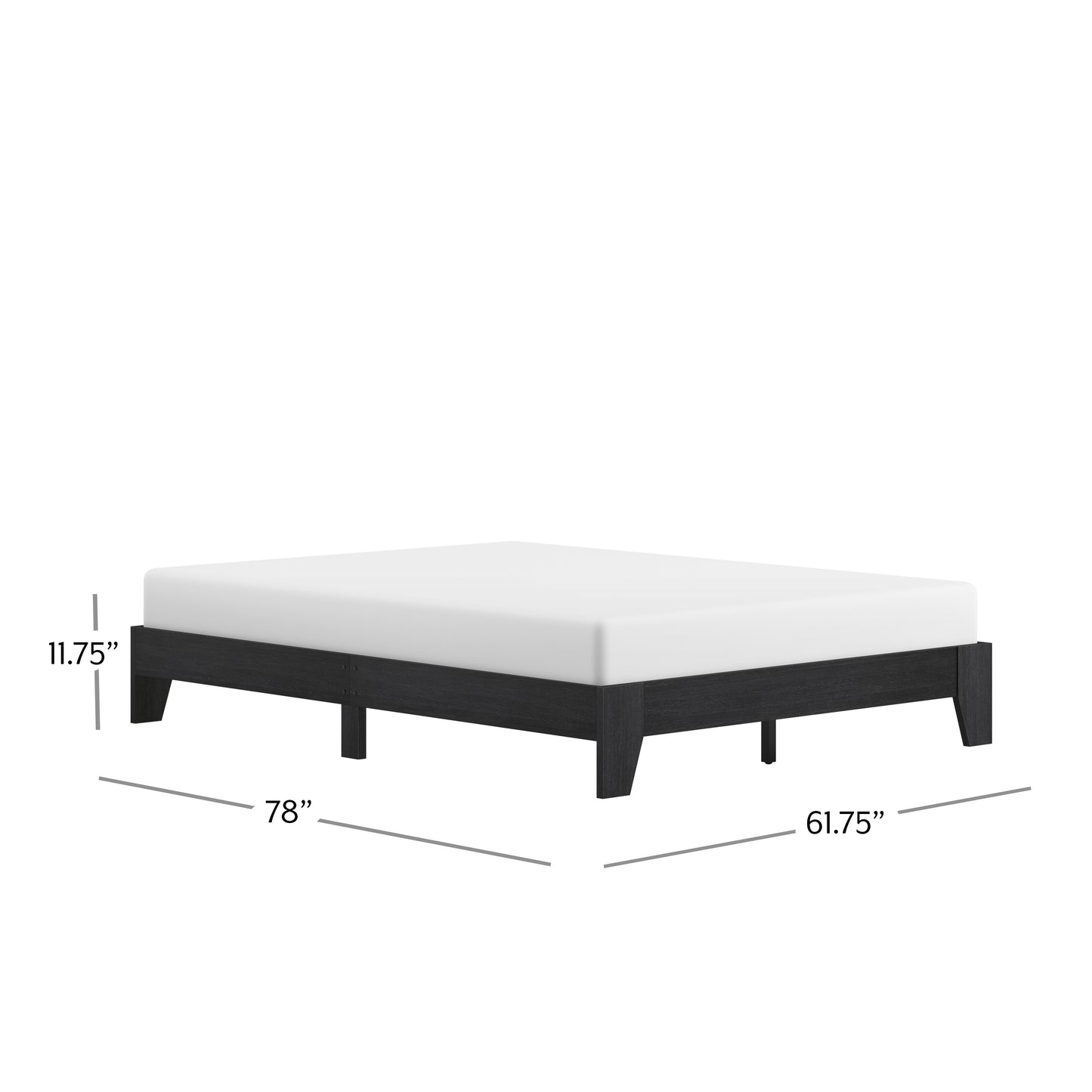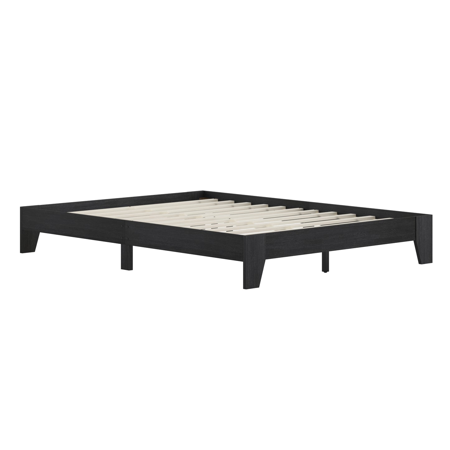 Simplify your life with this wood queen platform complete bed. The black oak finish acts as the perfect neutral backdrop for whichever colors or styles you choose to pair with it, or you could combine it with additional oak-finished pieces for a more traditional look. This blank canvas is what you make it. Legs along the perimeter and in the middle of the frame ensure that you’ll be fully supported as you relax in casual comfort. The 12-slat system means no box spring is required. Queen mattress required, not included. Assembly required.