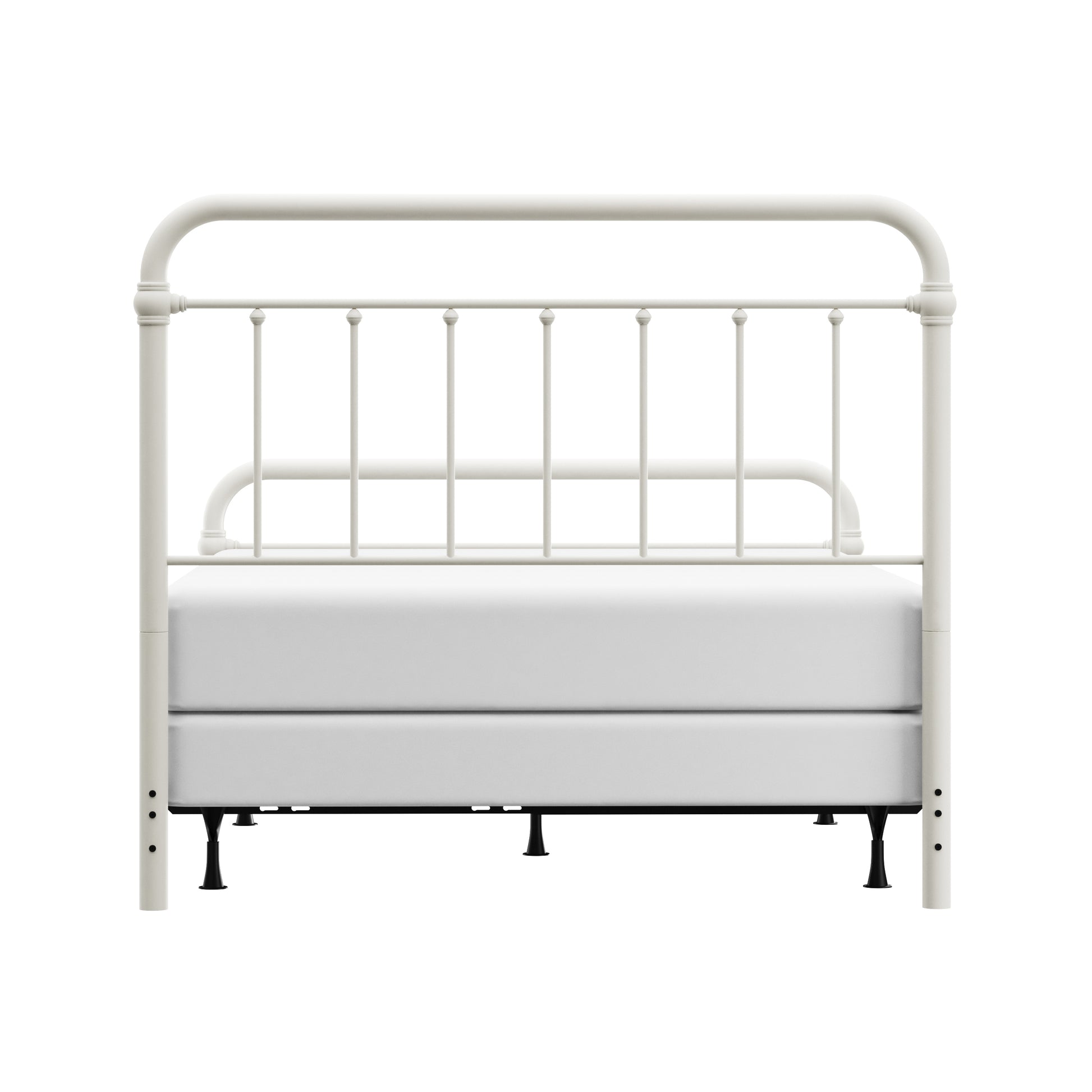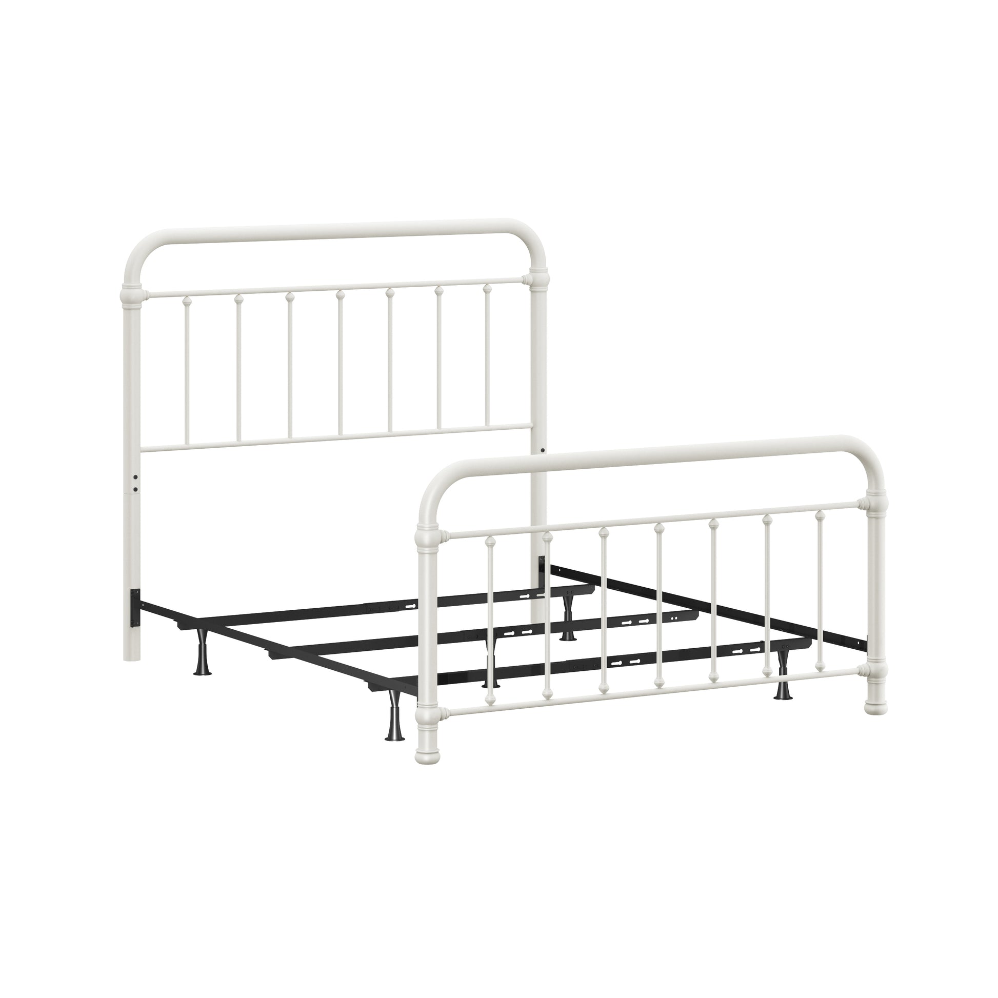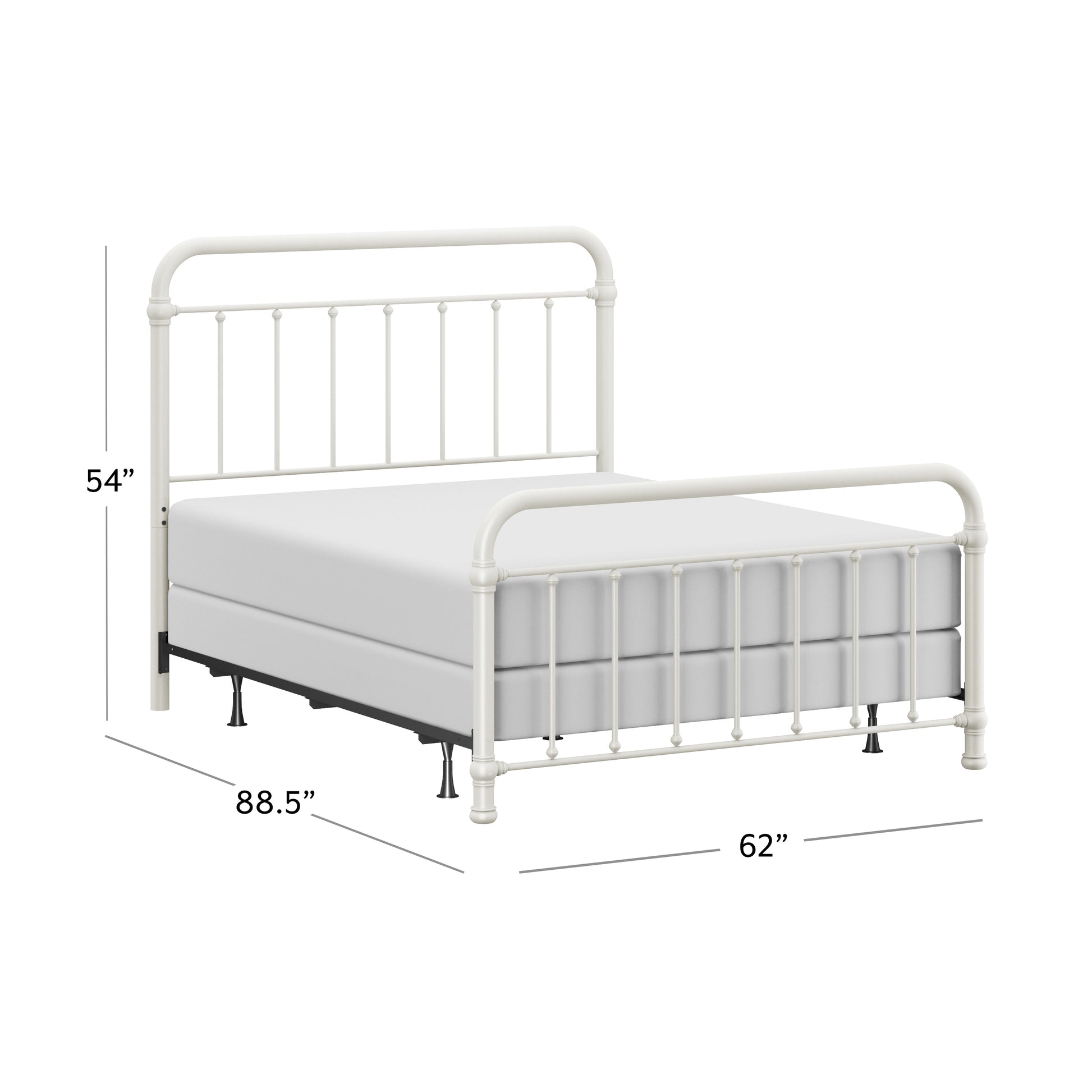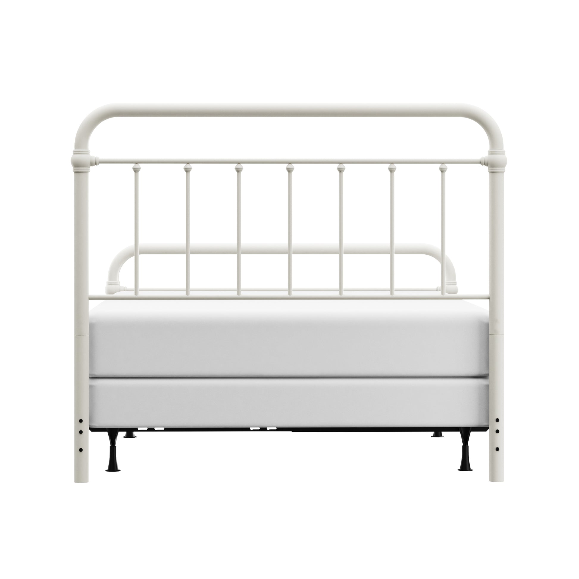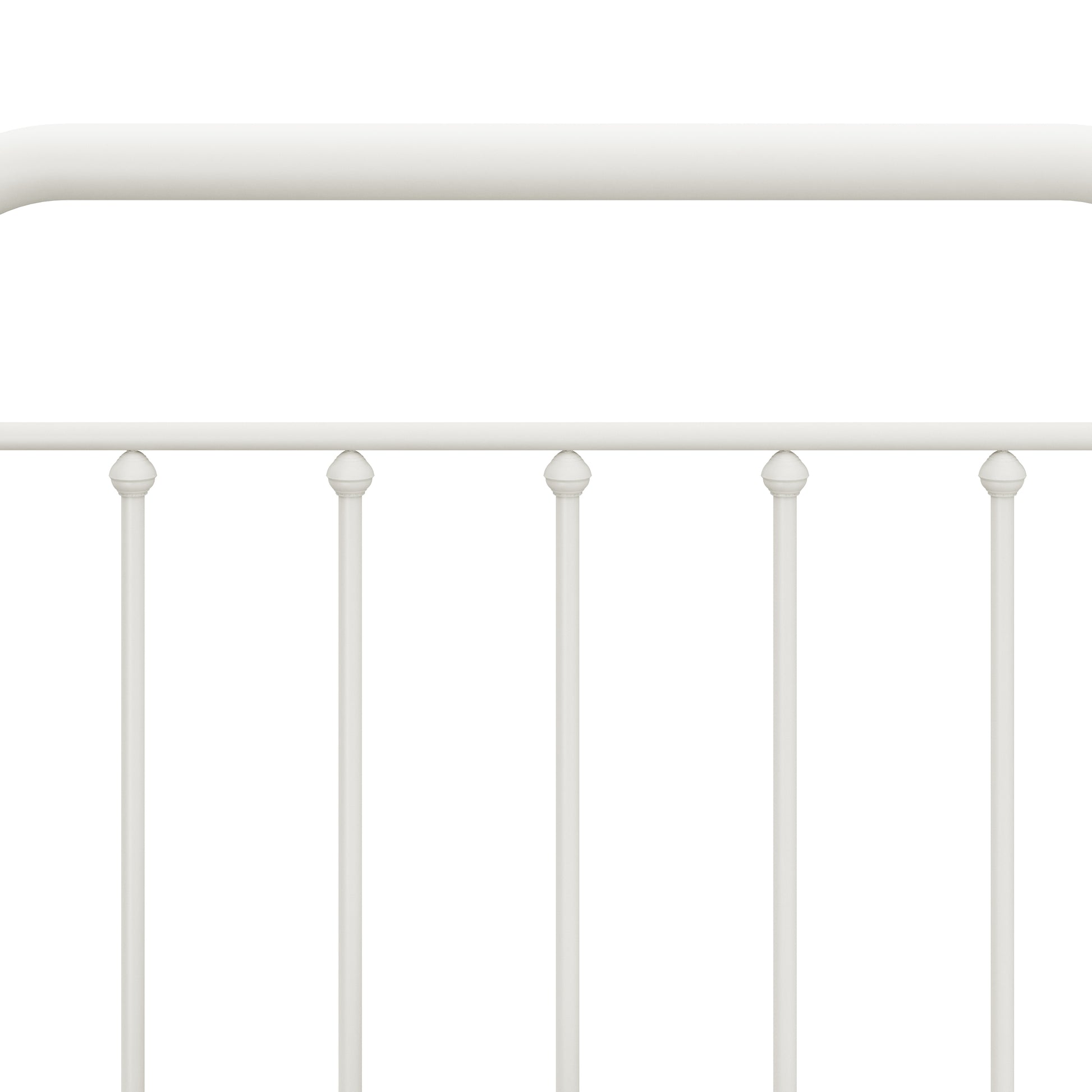 This full-size metal bed adds a touch of vintage style to any bedroom, featuring castings and fittings that seamlessly complement its rounded square design. Elegant and trendy, the white finish is a versatile choice that fits into a wide variety of decor styles and color schemes. Includes headboard, footboard, and bed frame. Box spring and mattress required; not included. Assembly required.