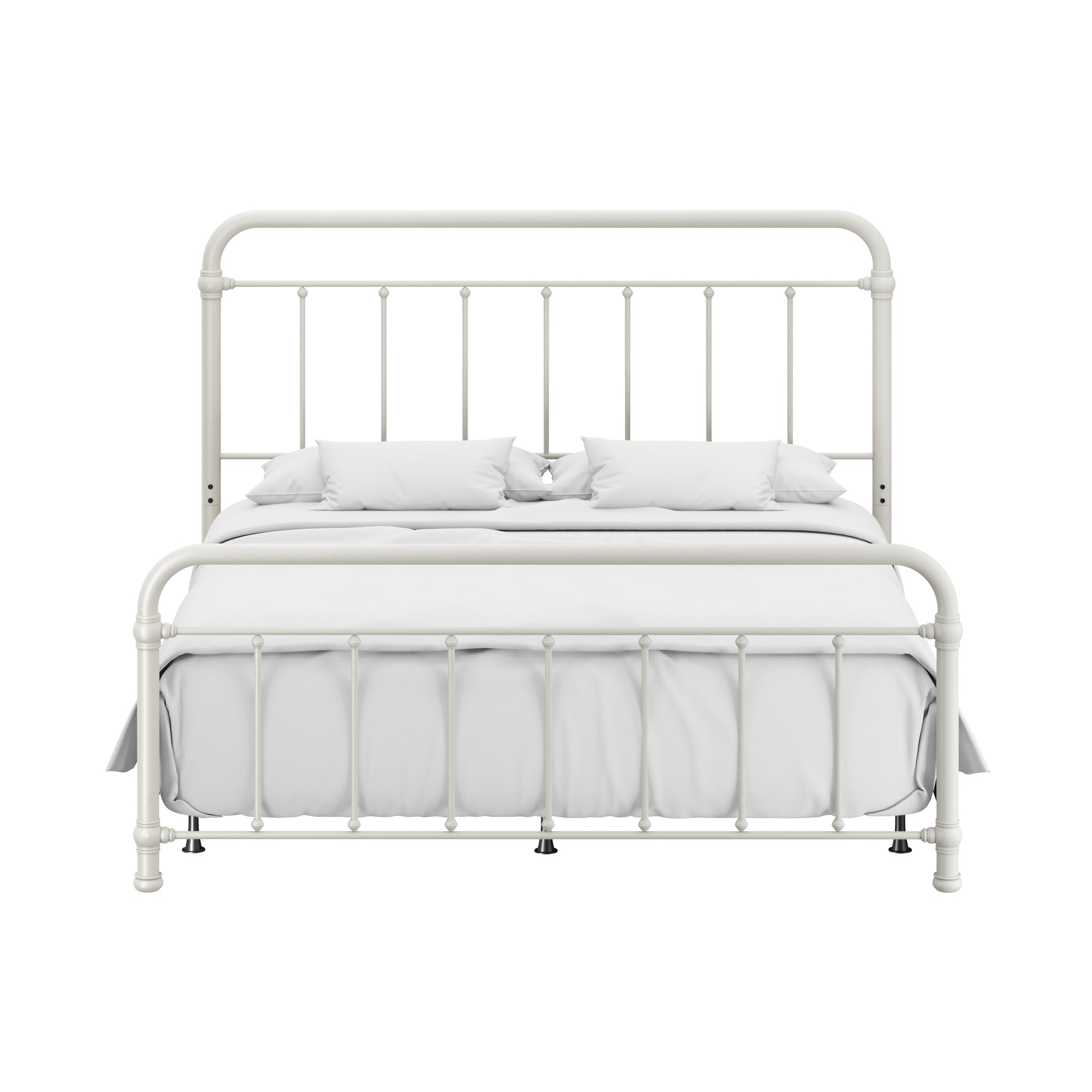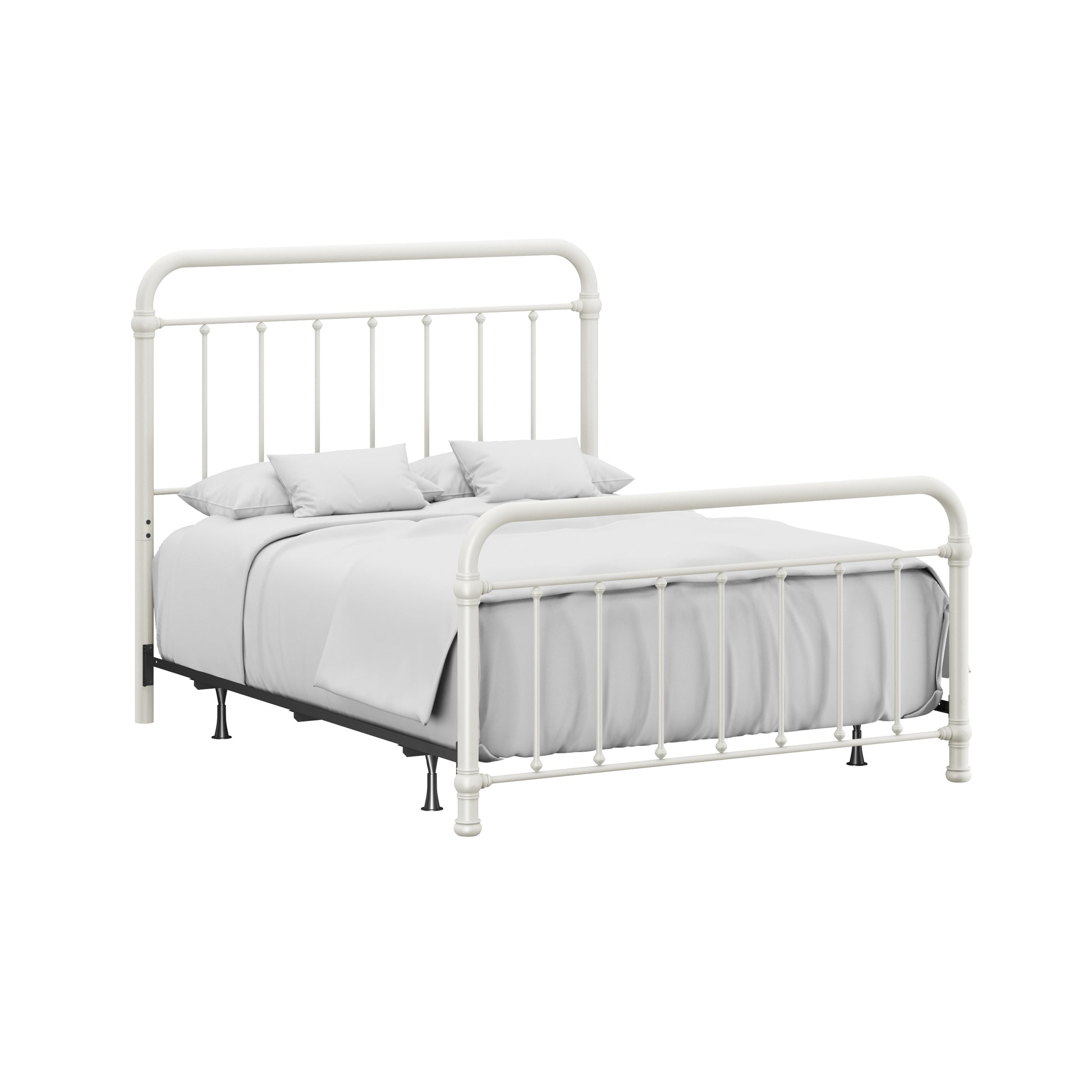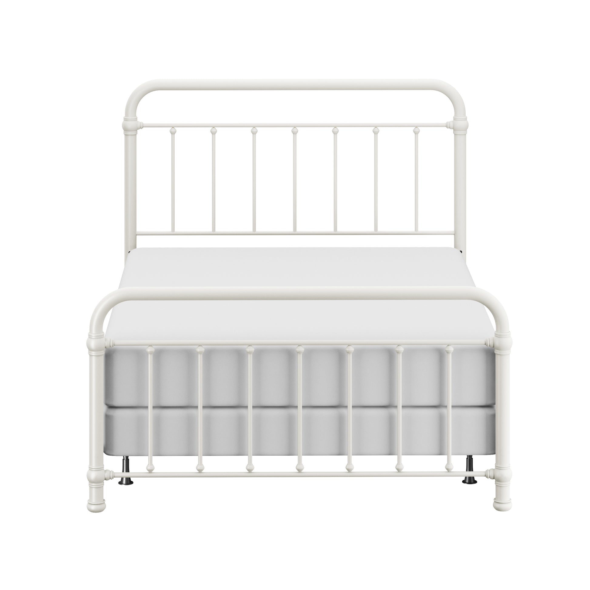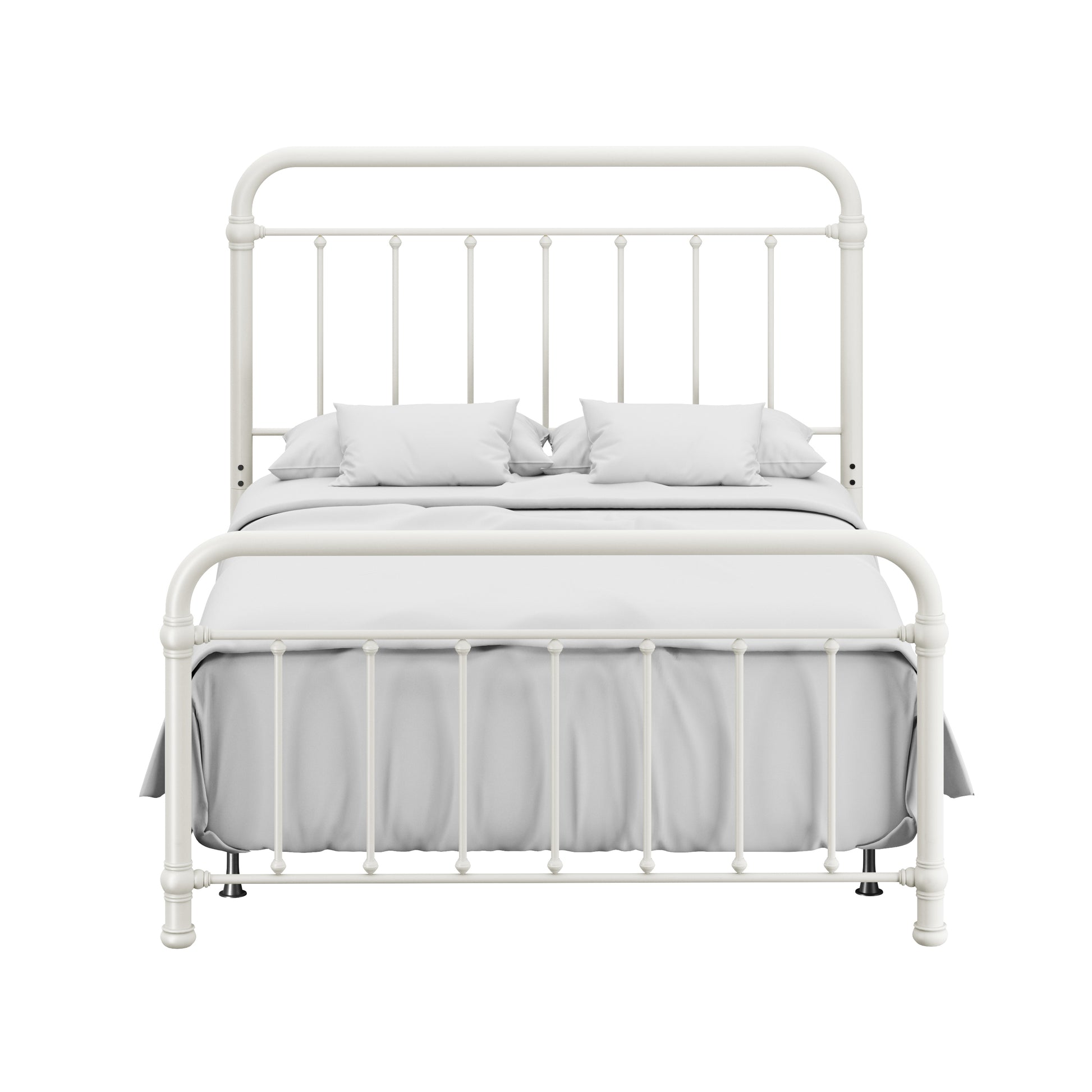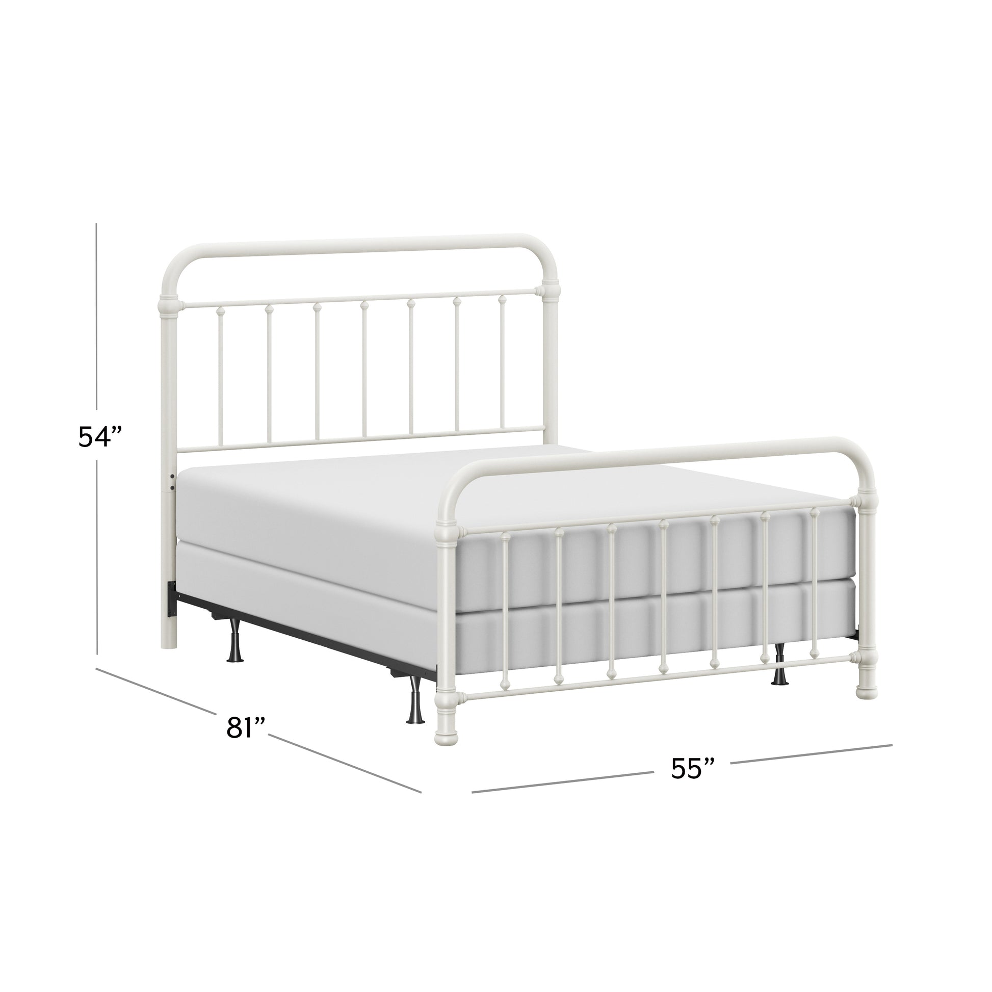 This full-size metal bed adds a touch of vintage style to any bedroom, featuring castings and fittings that seamlessly complement its rounded square design. Elegant and trendy, the white finish is a versatile choice that fits into a wide variety of decor styles and color schemes. Includes headboard, footboard, and bed frame. Box spring and mattress required; not included. Assembly required.