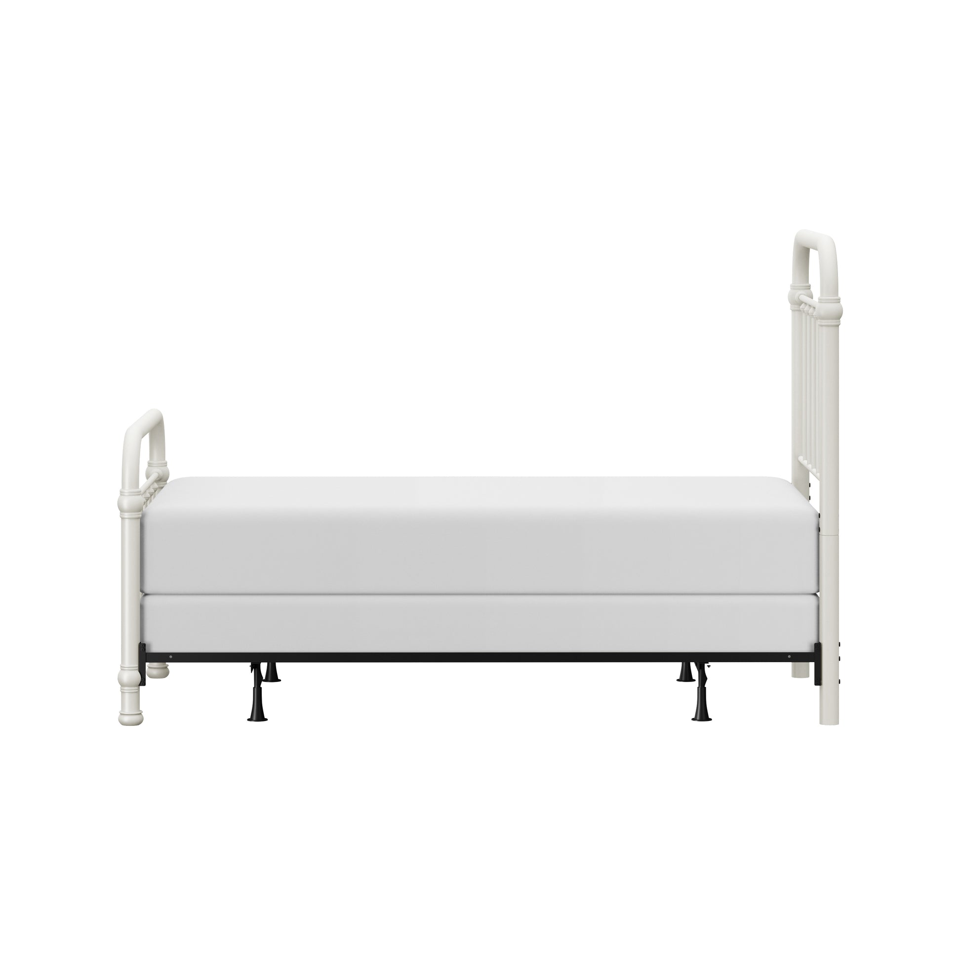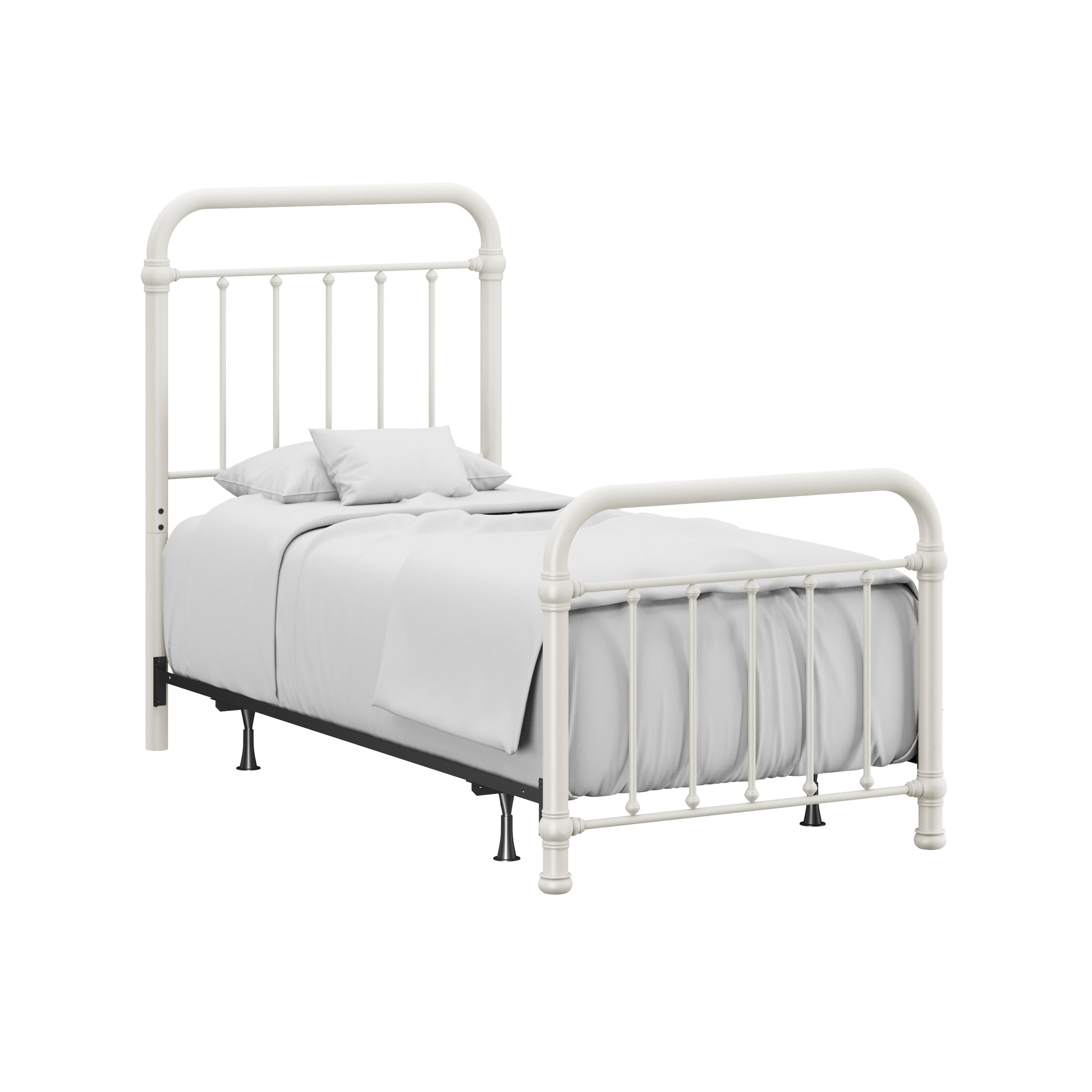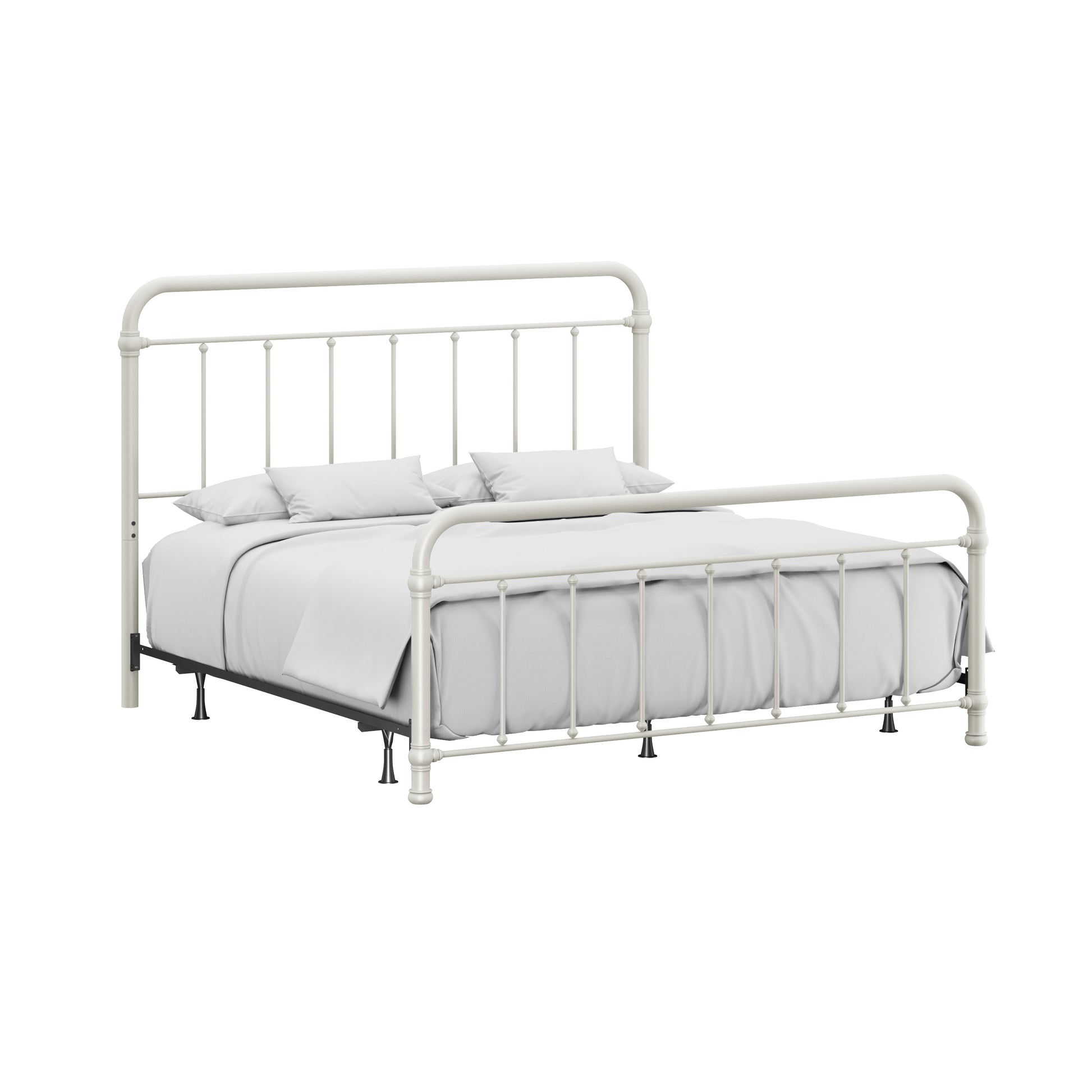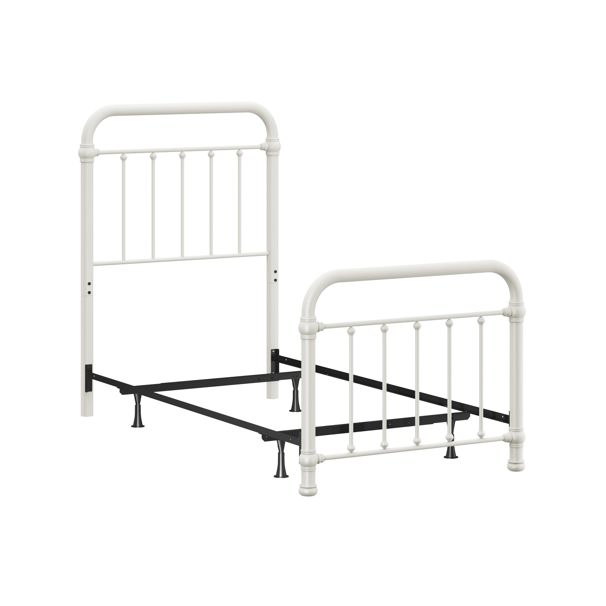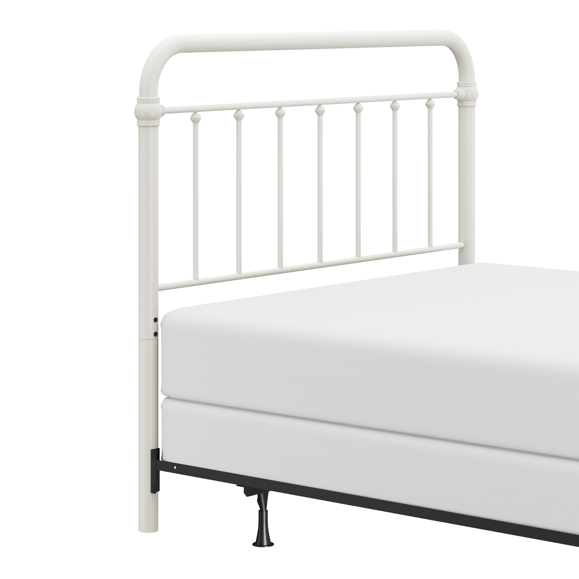 This full-size metal bed adds a touch of vintage style to any bedroom, featuring castings and fittings that seamlessly complement its rounded square design. Elegant and trendy, the white finish is a versatile choice that fits into a wide variety of decor styles and color schemes. Includes headboard, footboard, and bed frame. Box spring and mattress required; not included. Assembly required.