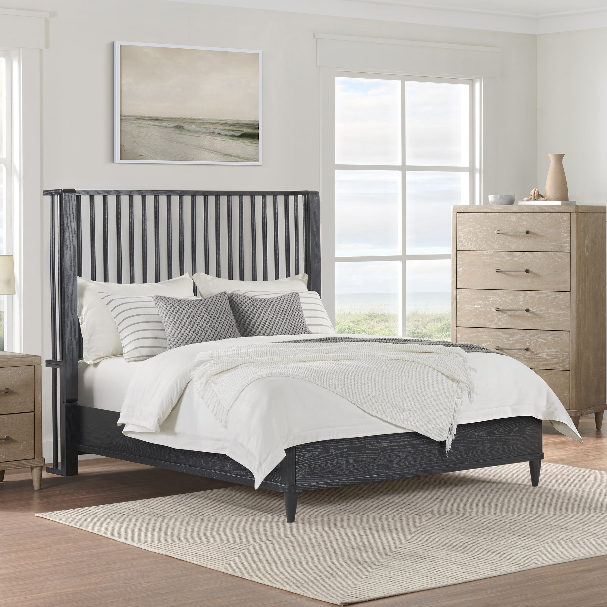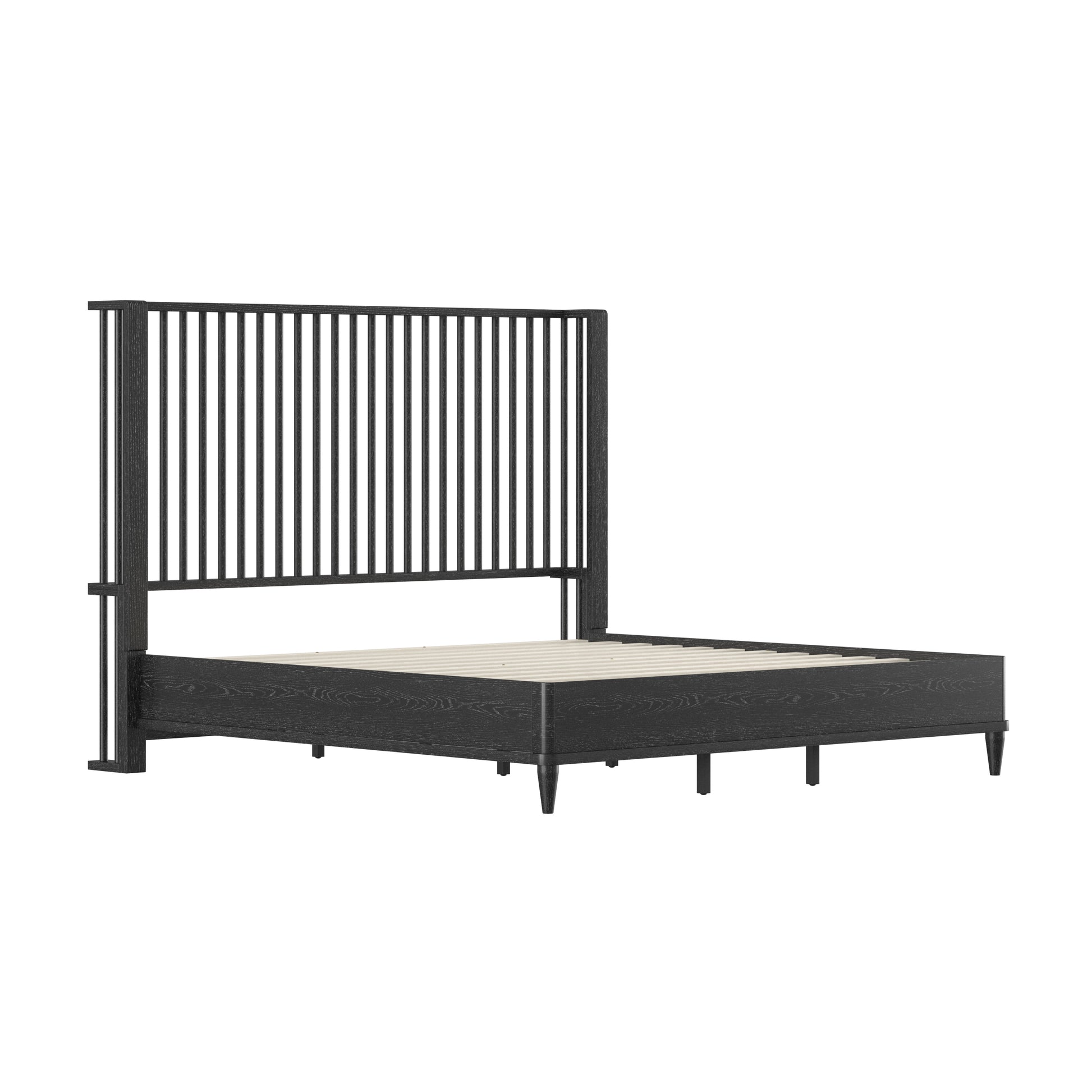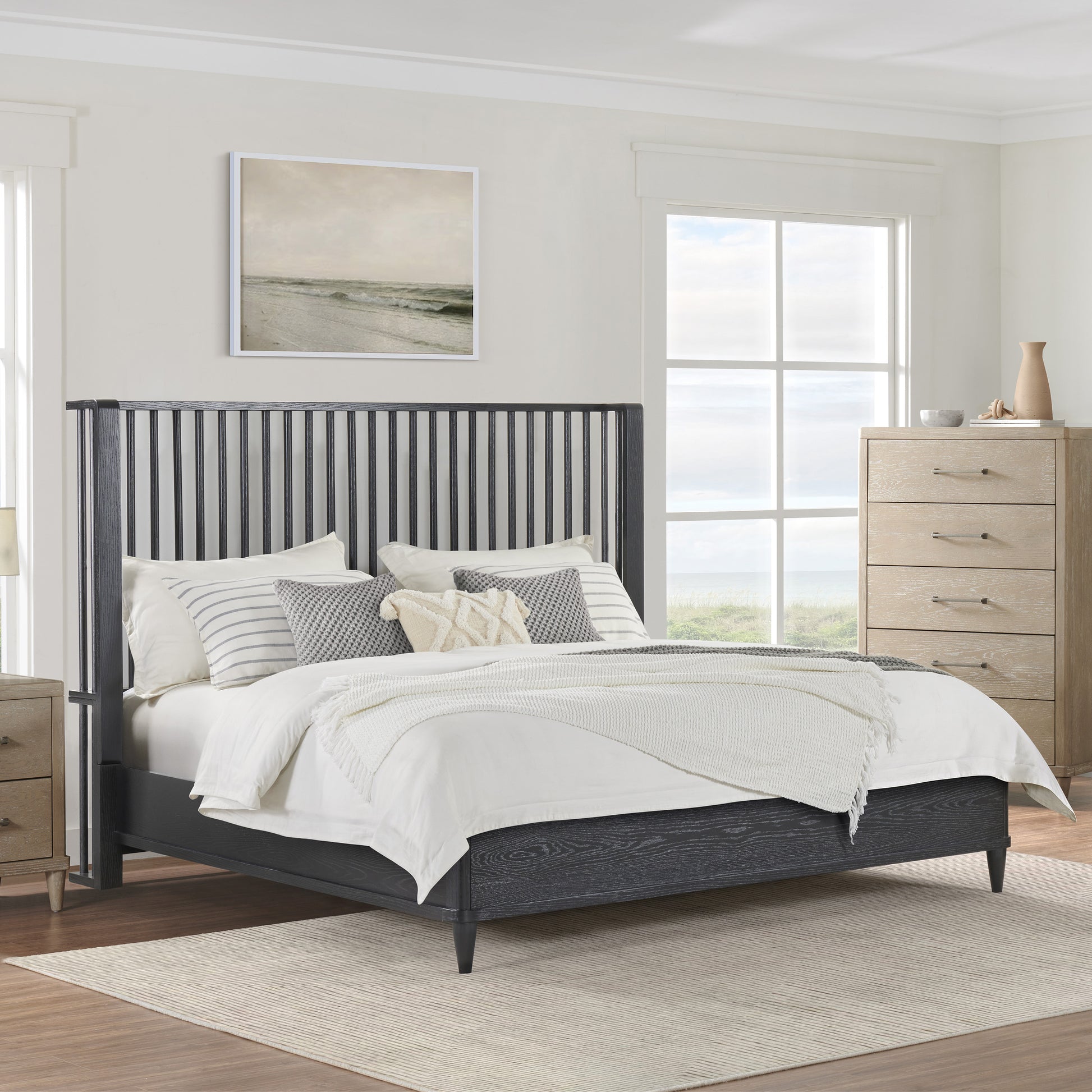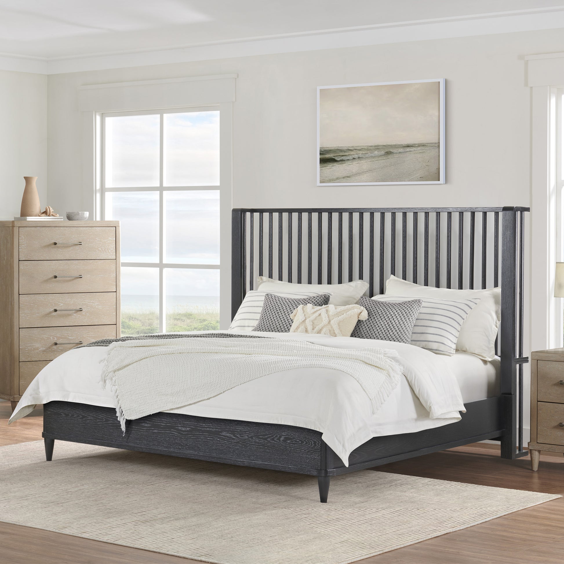 Coastal farmhouse king platform bed boasts a statement spindle headboard