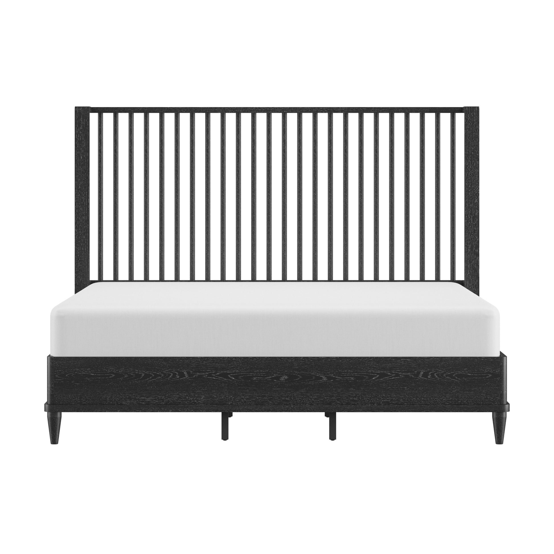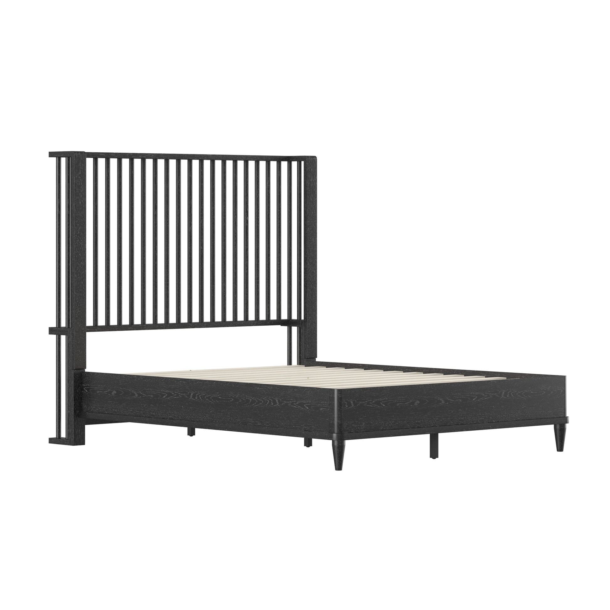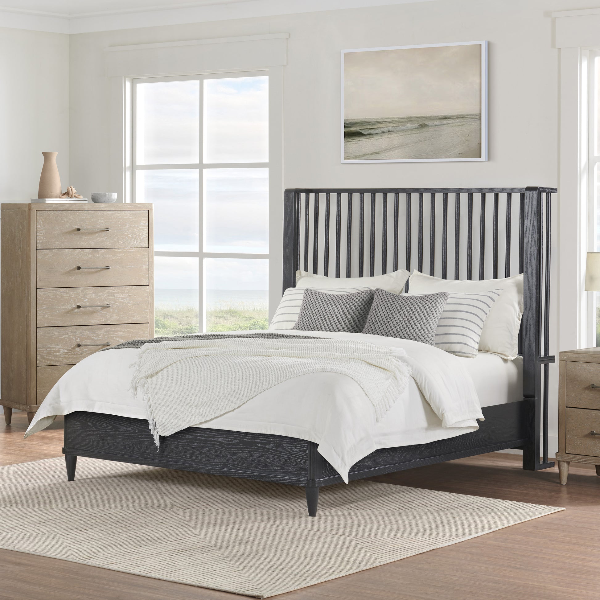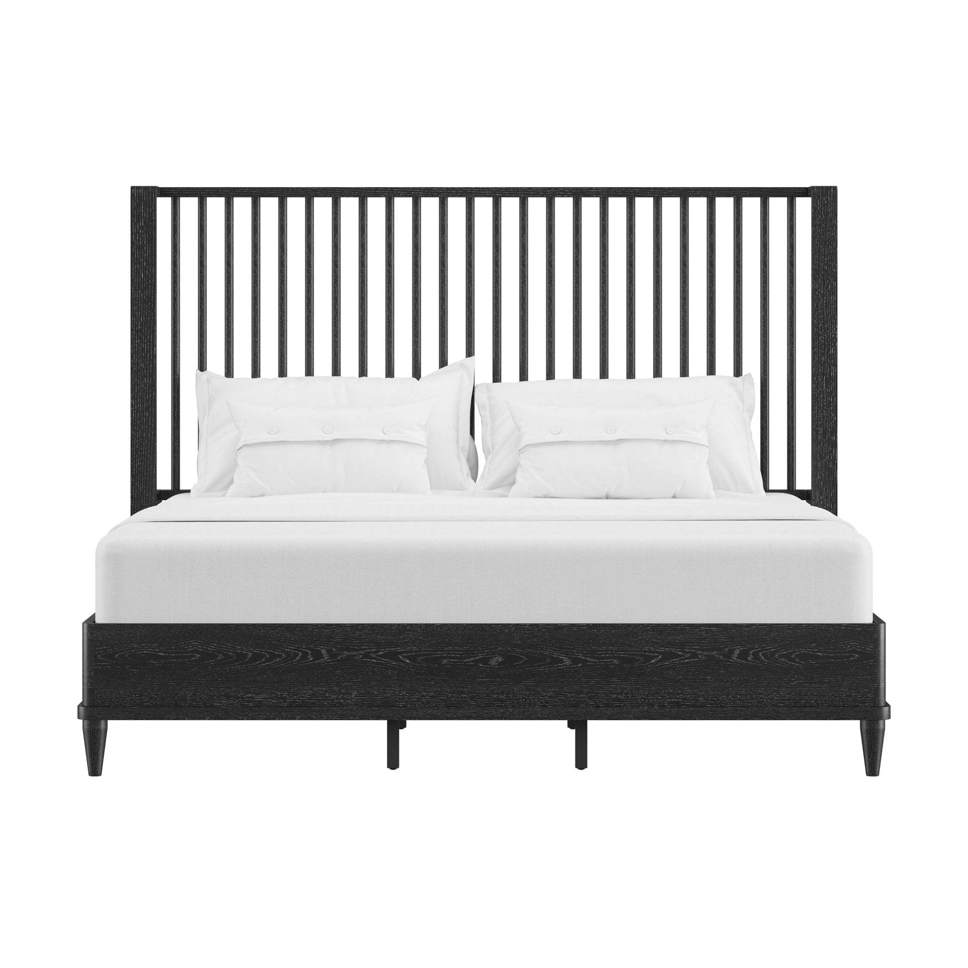 Coastal farmhouse king platform bed boasts a statement spindle headboard