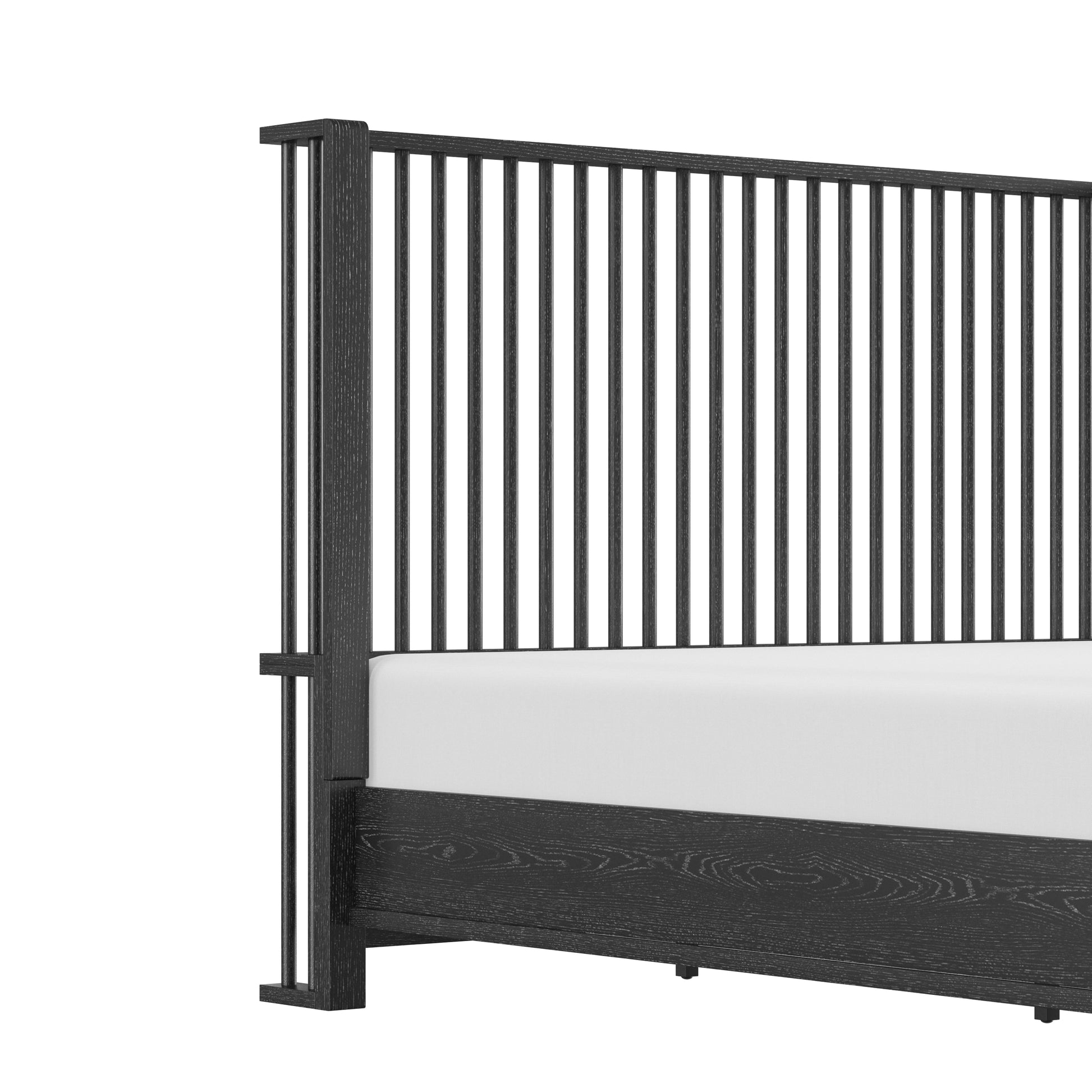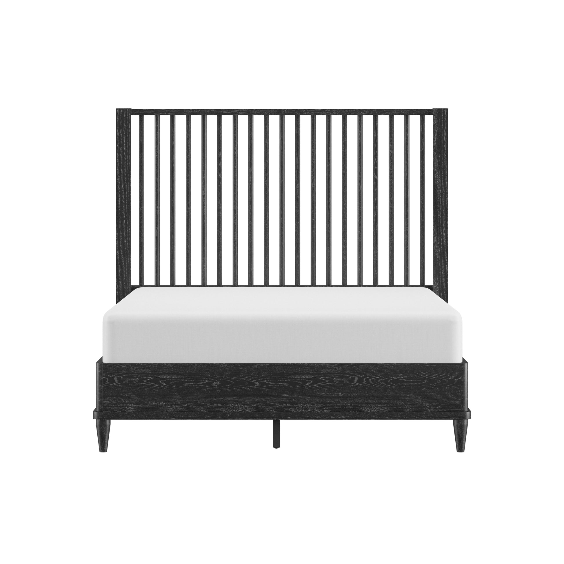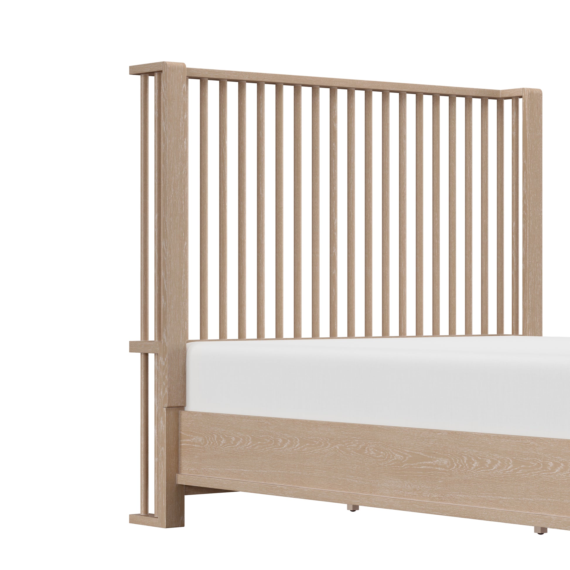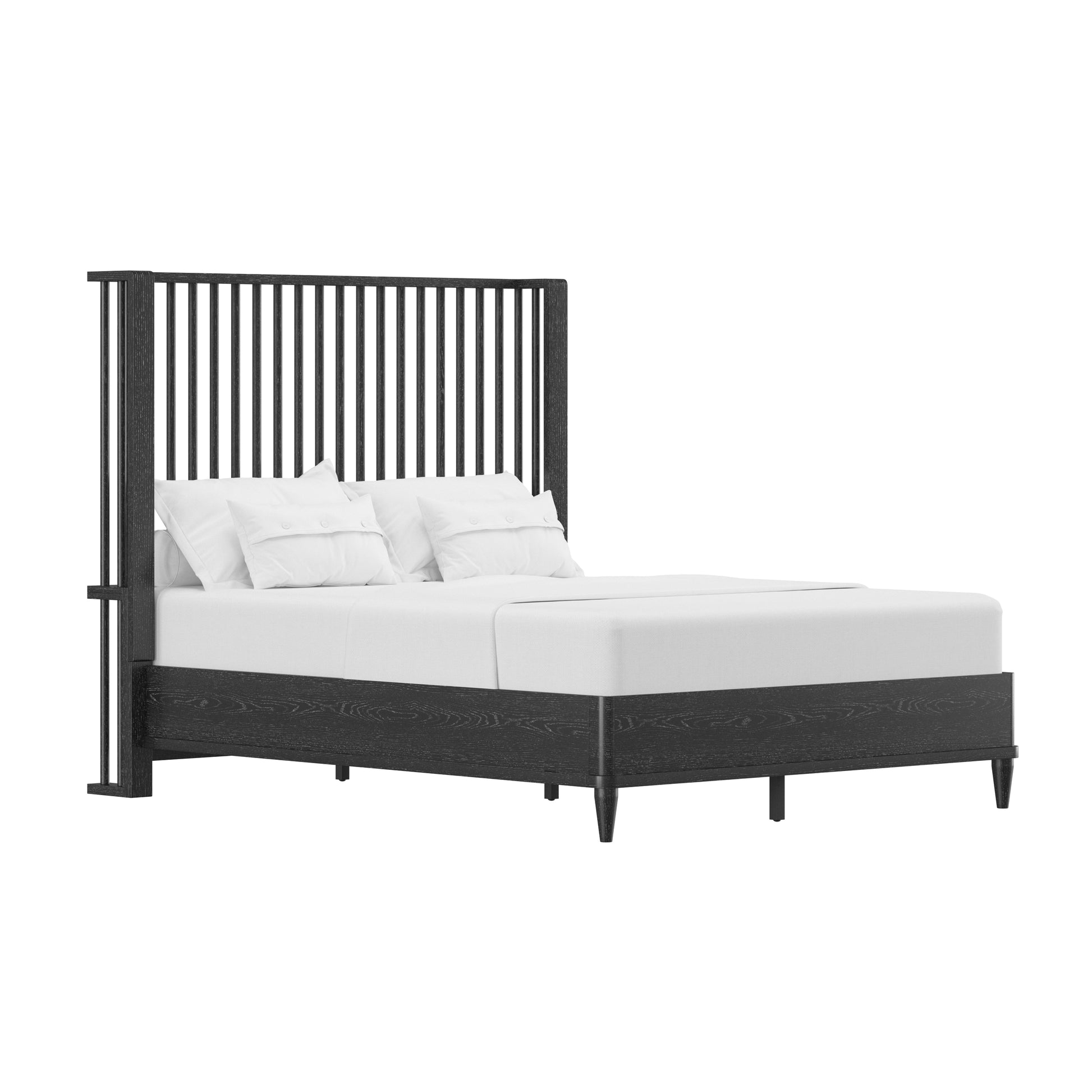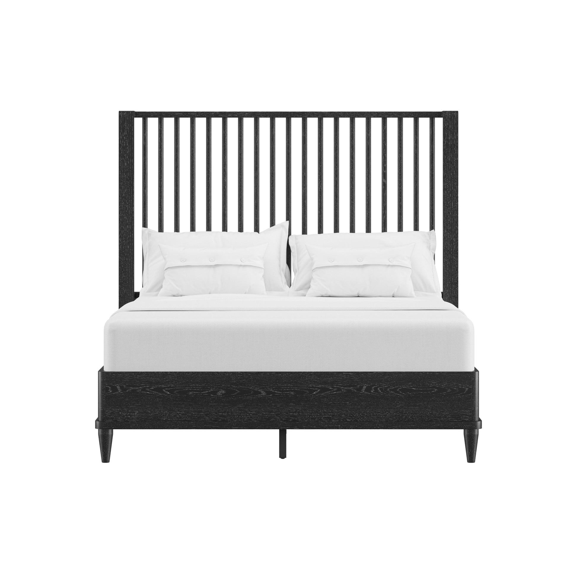 Coastal farmhouse king platform bed boasts a statement spindle headboard