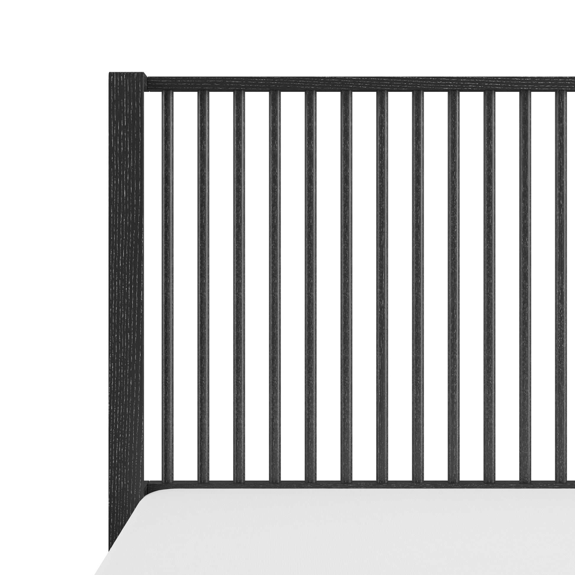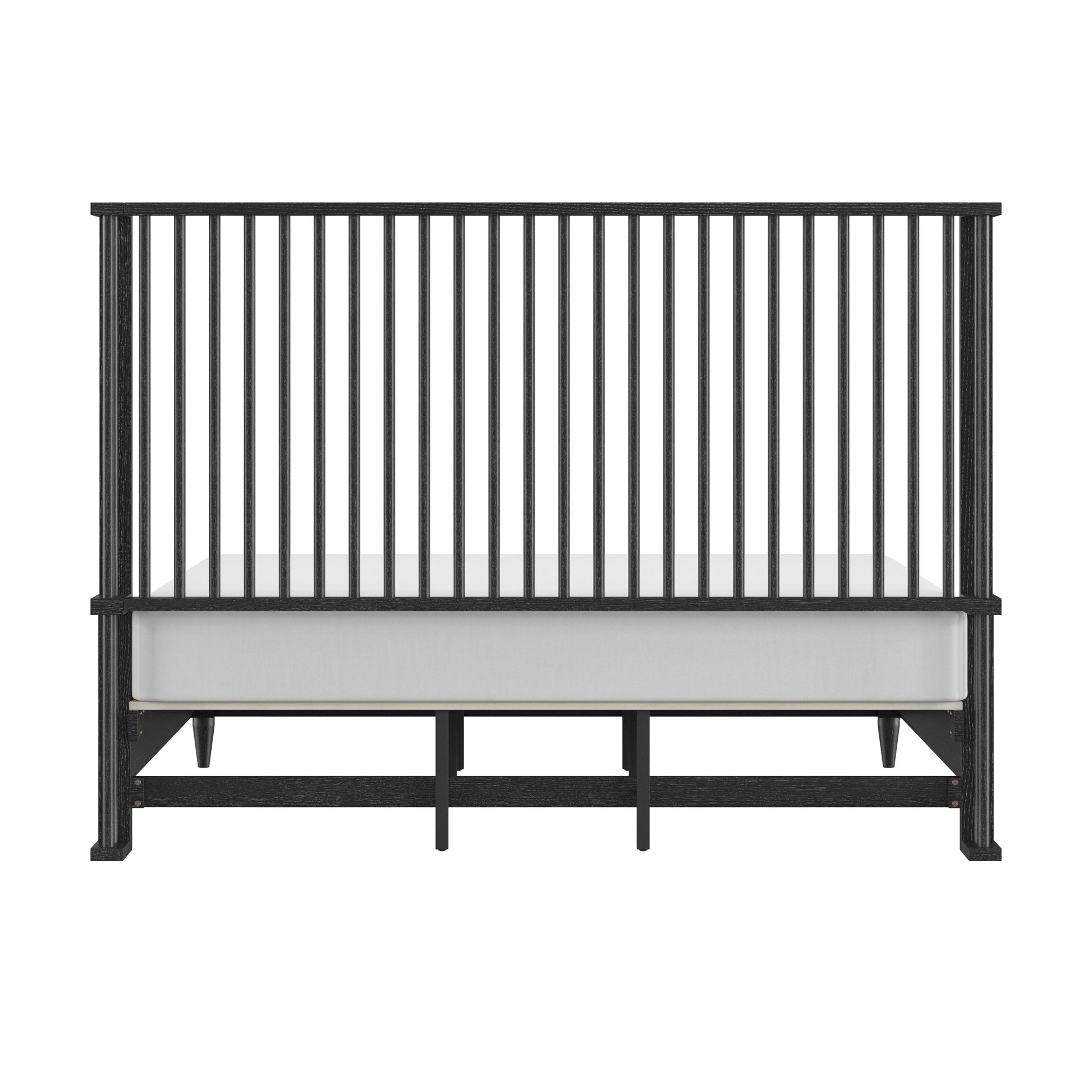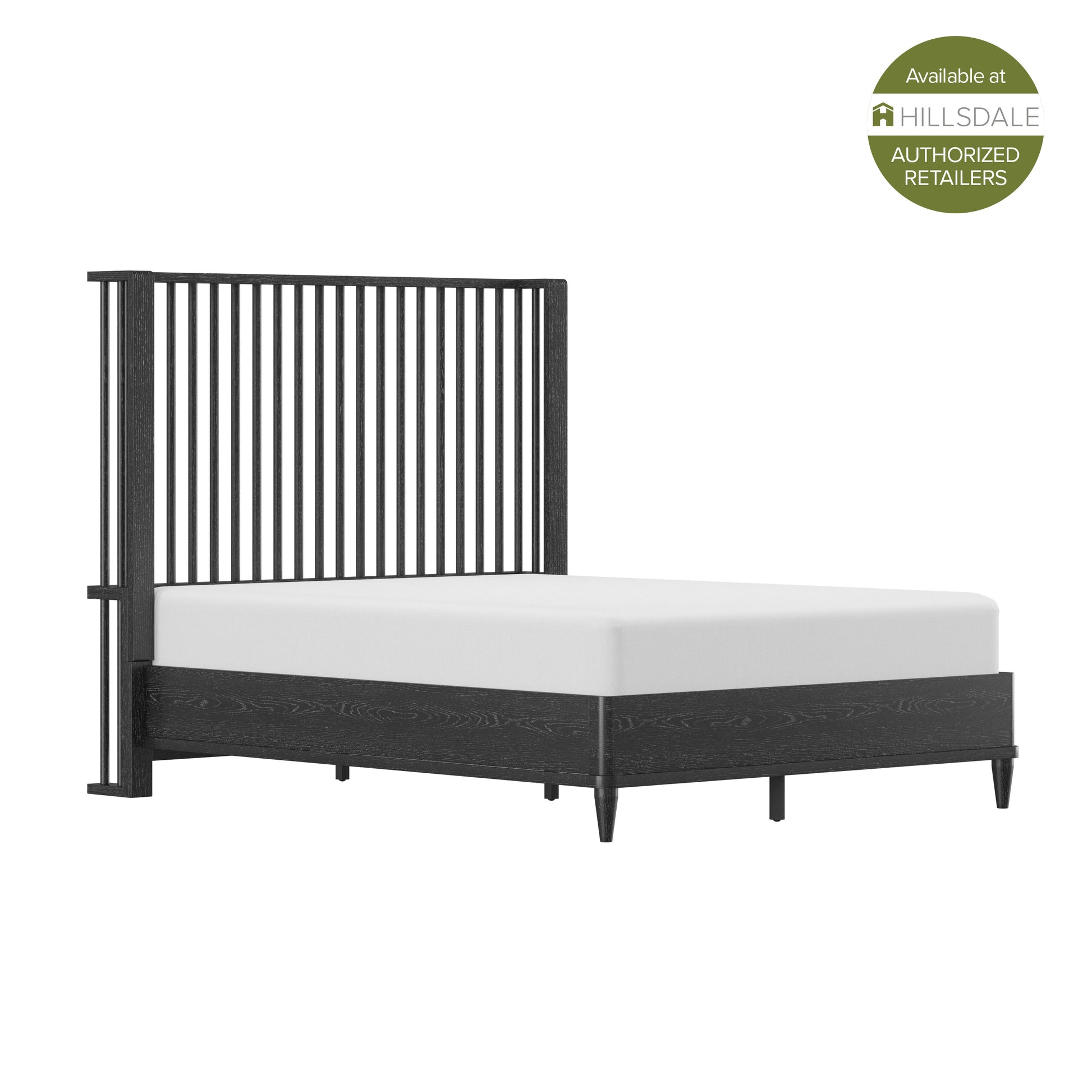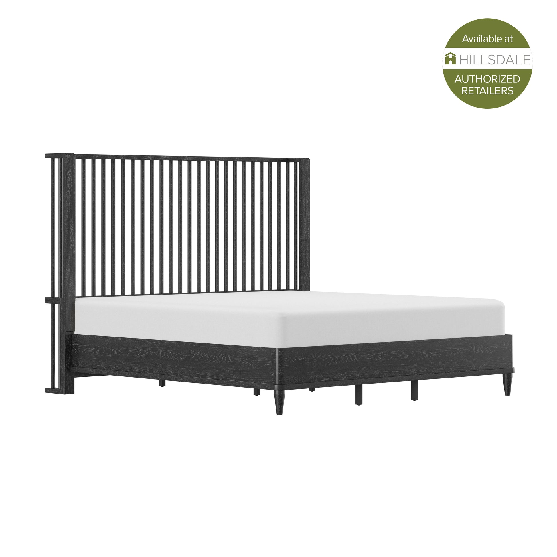 Coastal farmhouse king platform bed boasts a statement spindle headboard