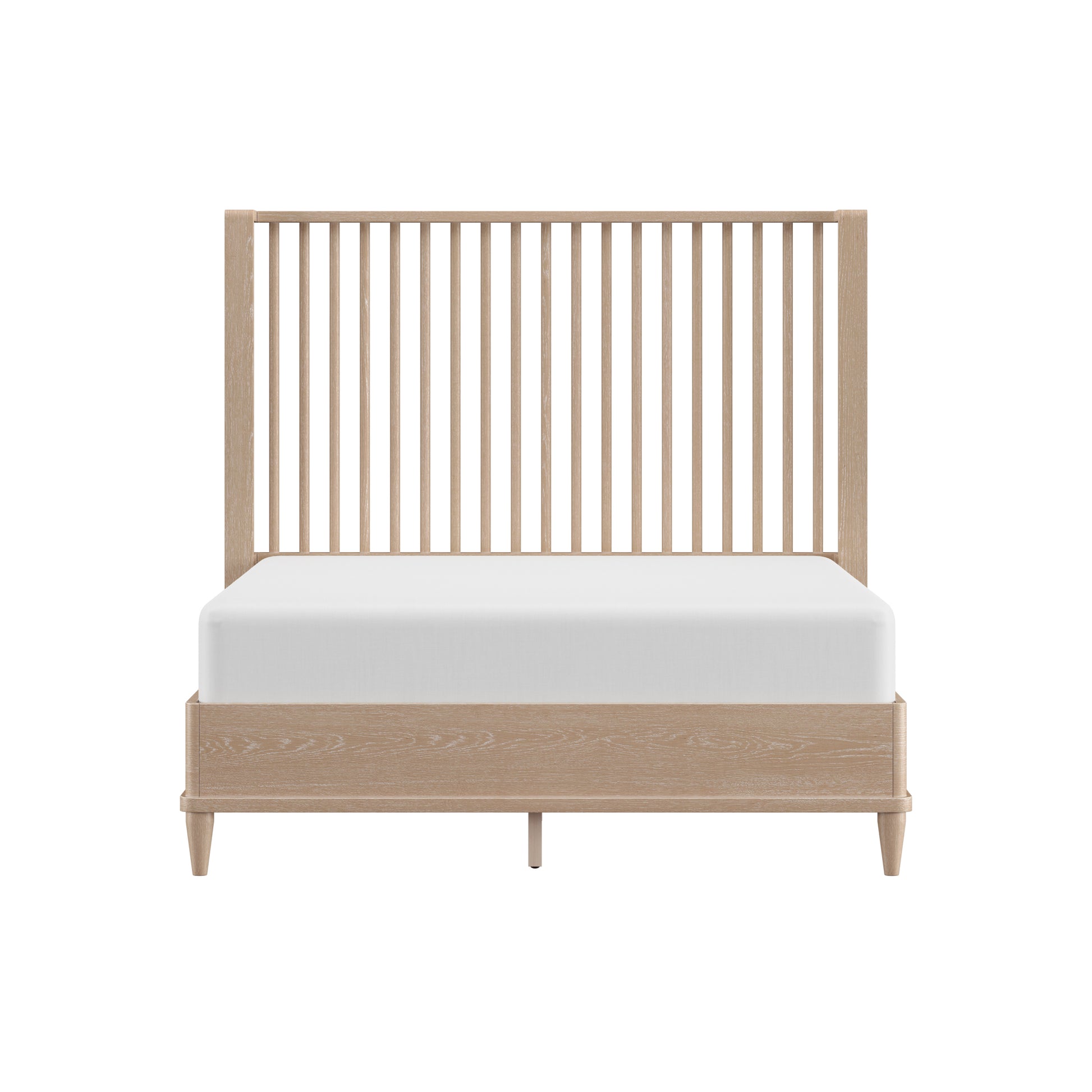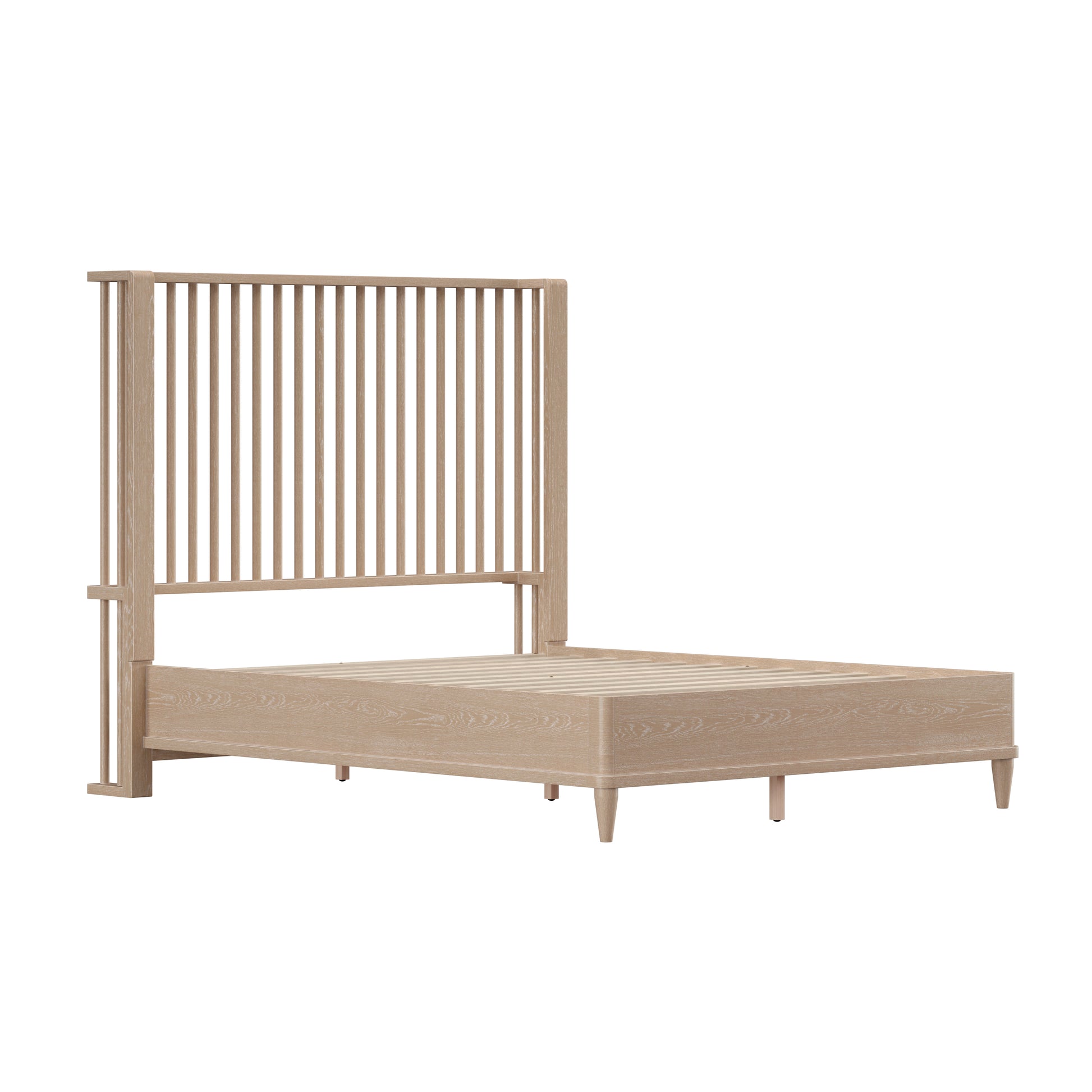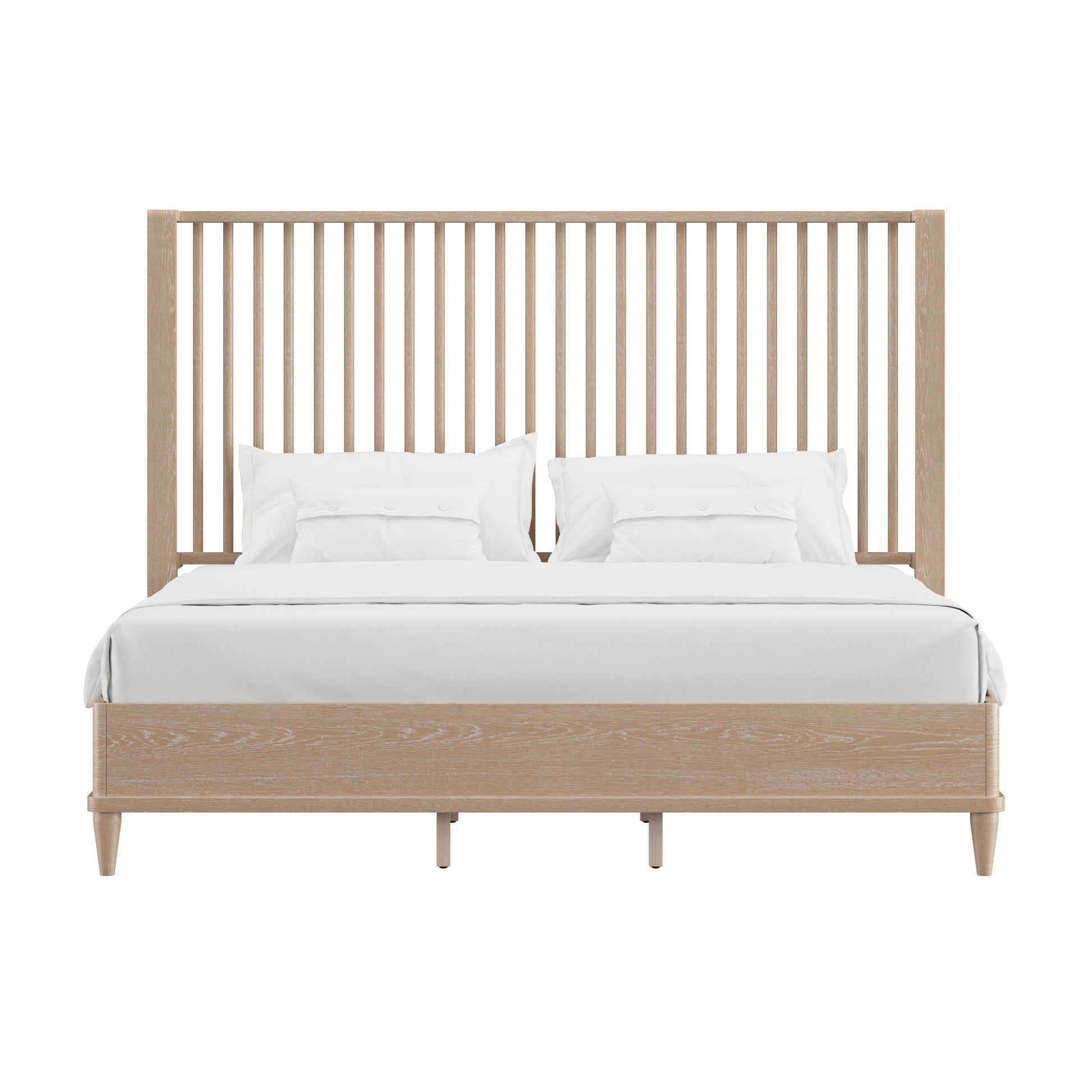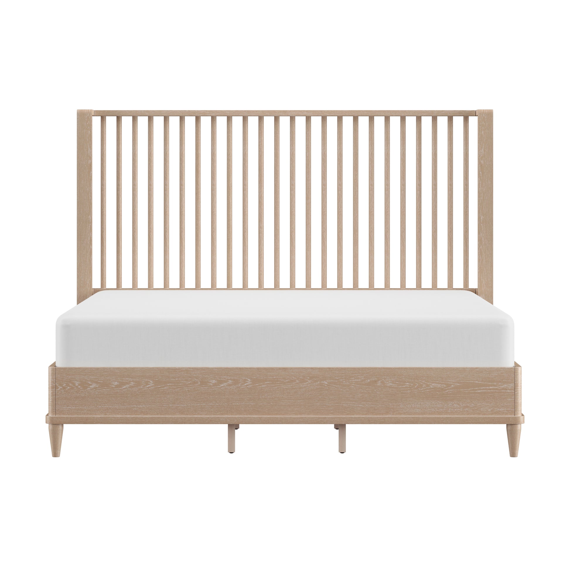 With rounded corners and elegantly tapered legs, this king platform shelter bed is the picture of refined simplicity. A light oak finish allows the rich wood grain of the solid wood construction to shine through, highlighting its natural beauty and texture. The statement headboard is a stunning display of coastal farmhouse style, with an array of carefully placed spindles running along the headboard, showcasing a gorgeous wingback silhouette. Molding winds across the base of this piece in a clean line, adding further dimension. Designed in the platform style, this bed doesn’t require a box spring. Mattress not included. Assembly required.