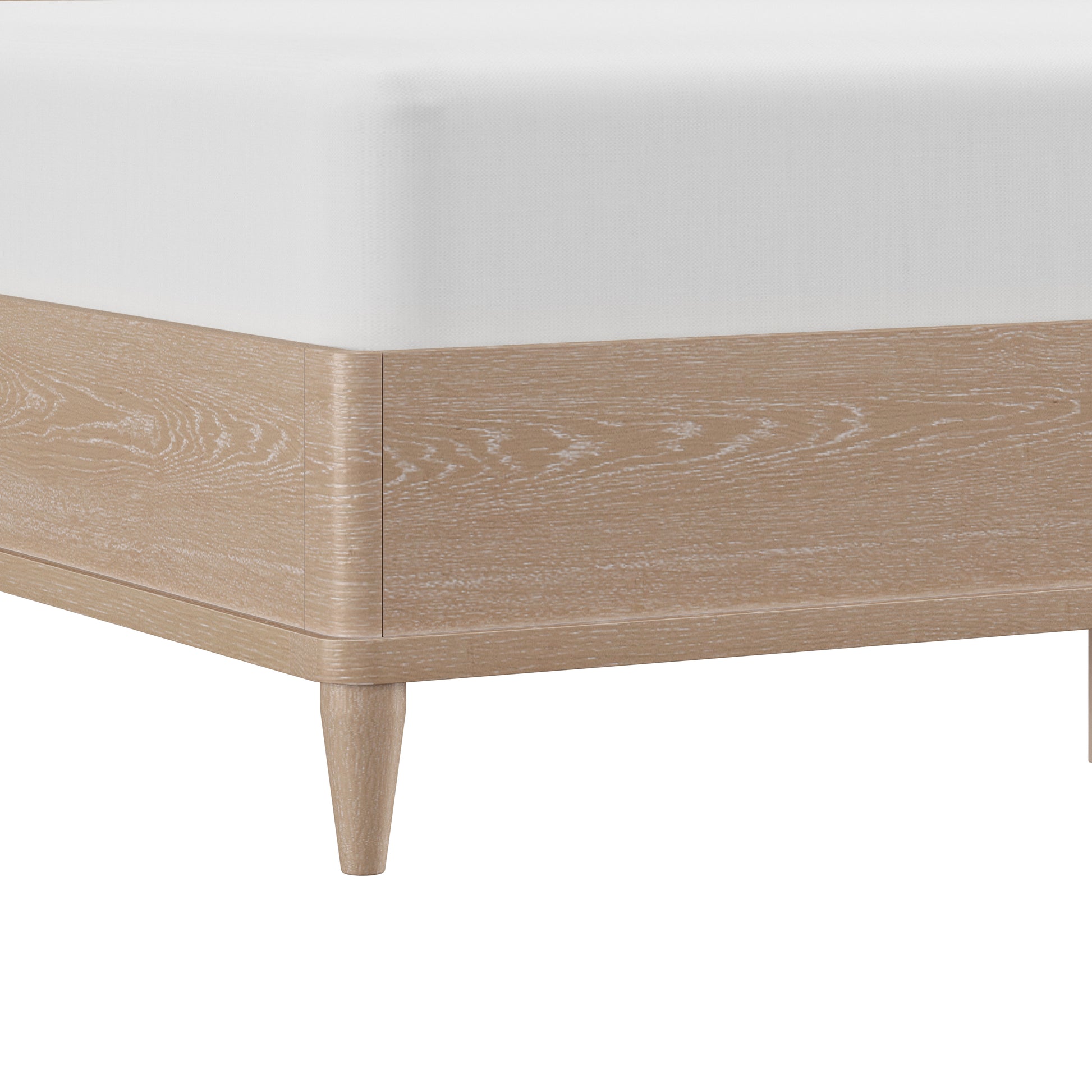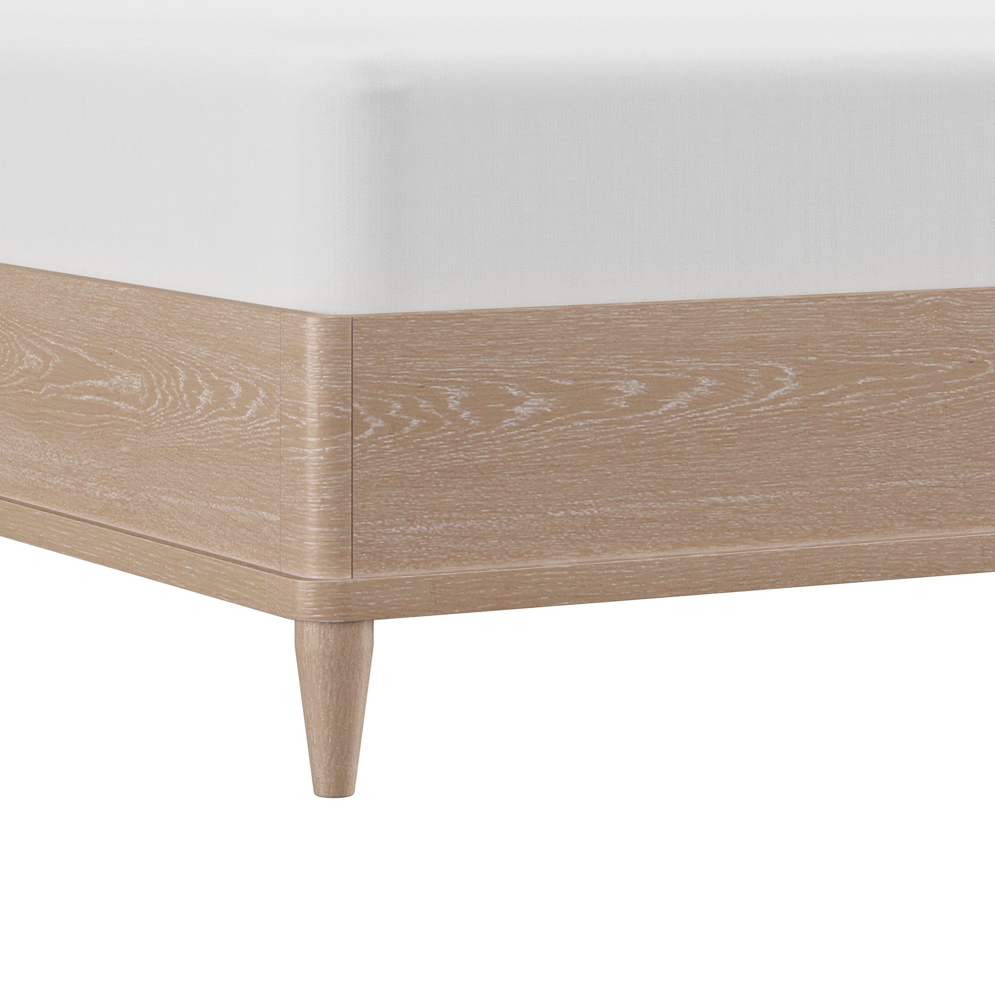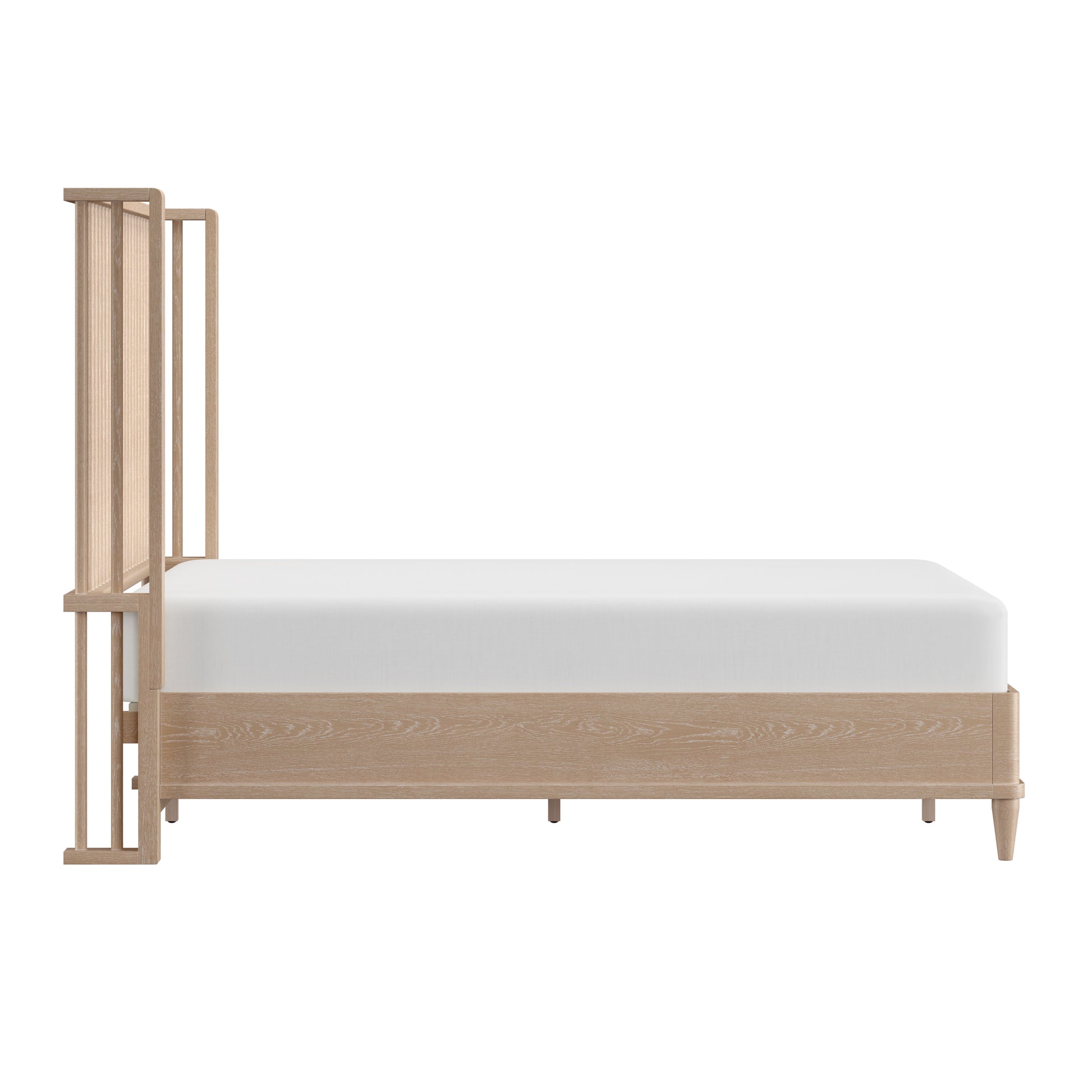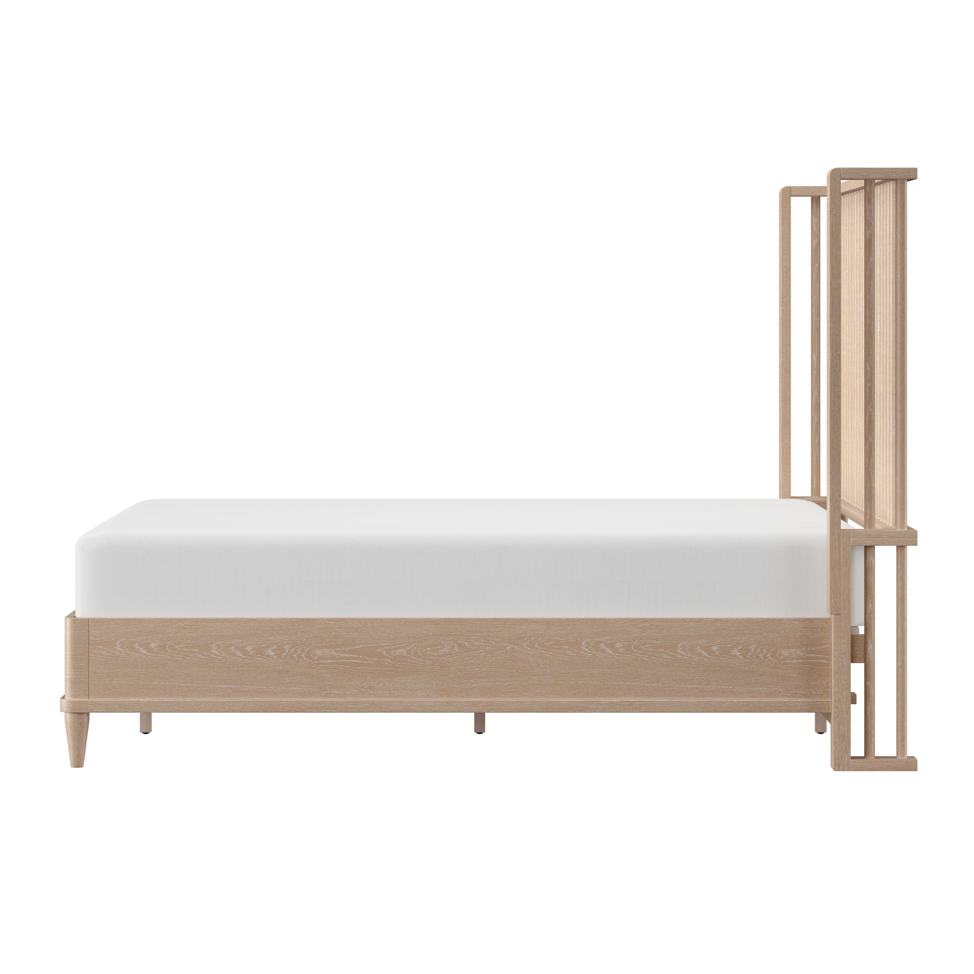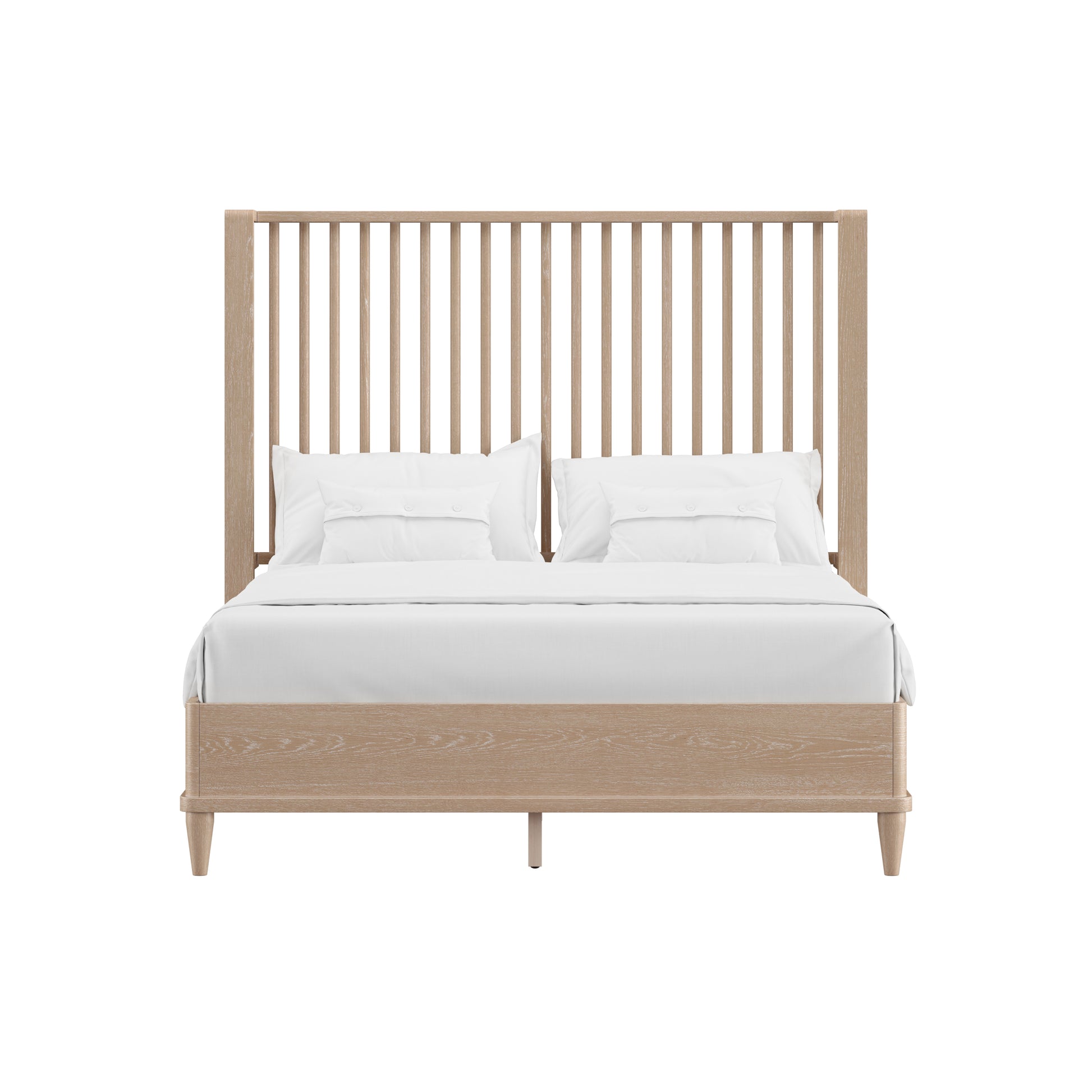 With rounded corners and elegantly tapered legs, this king platform shelter bed is the picture of refined simplicity. A light oak finish allows the rich wood grain of the solid wood construction to shine through, highlighting its natural beauty and texture. The statement headboard is a stunning display of coastal farmhouse style, with an array of carefully placed spindles running along the headboard, showcasing a gorgeous wingback silhouette. Molding winds across the base of this piece in a clean line, adding further dimension. Designed in the platform style, this bed doesn’t require a box spring. Mattress not included. Assembly required.